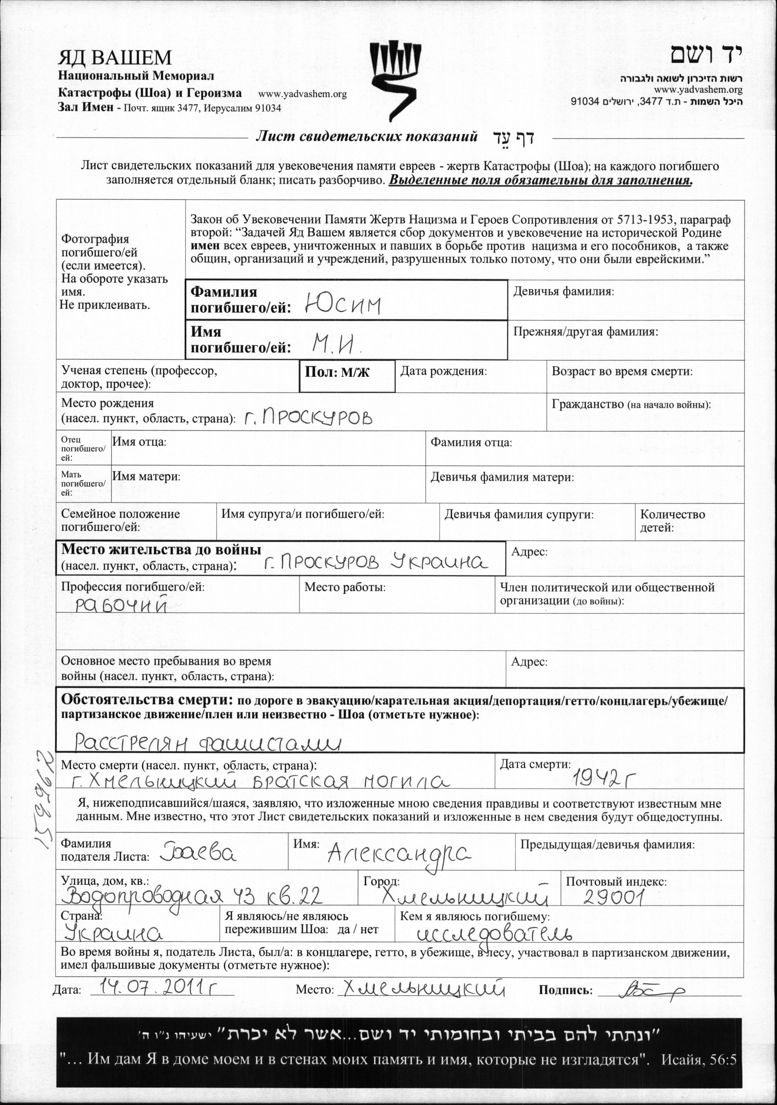 M Yusim wurde in Proskurov, Ukraine (UdSSR) geboren. Er war der Sohn von I. Er war Arbeiter/-in. Vor dem Zweiten Weltkrieg lebte er in Proskurov, Ukraine (UdSSR). Während des Krieges war er in Khmelnitskiy, Ukraine (UdSSR).