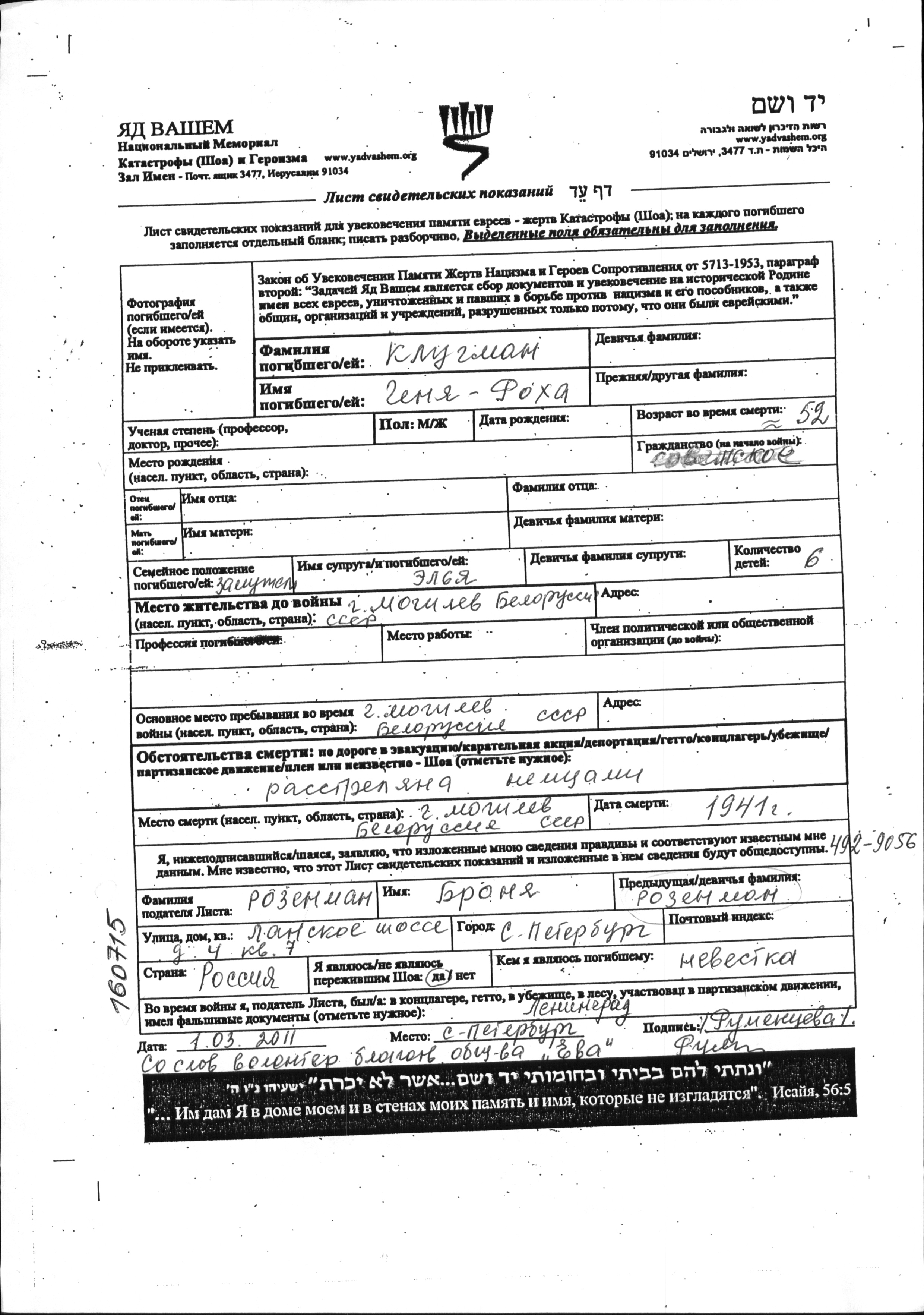 Genya Rokha Klugman. Sie war mit Elya Verheiratet. Vor dem Zweiten Weltkrieg lebte sie in Mogilev, Weißrussland (UdSSR). Während des Krieges war sie in Mogilev, Weißrussland (UdSSR).