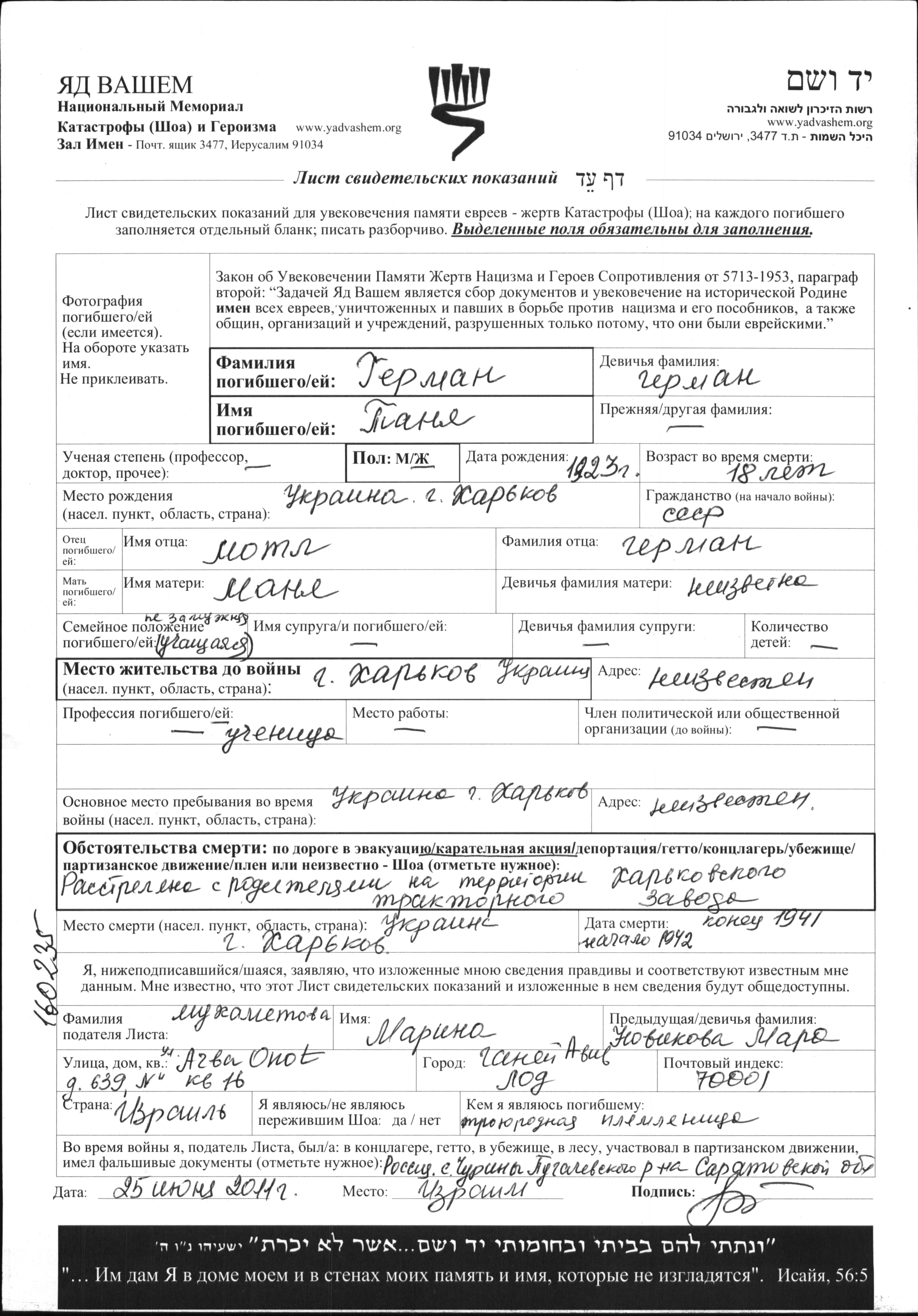 Tanya wurde in der Schoah ermordet. Todesort: Traktorny Zavod Kharkov, Ukraine (UdSSR) im Jahr 12/1941.