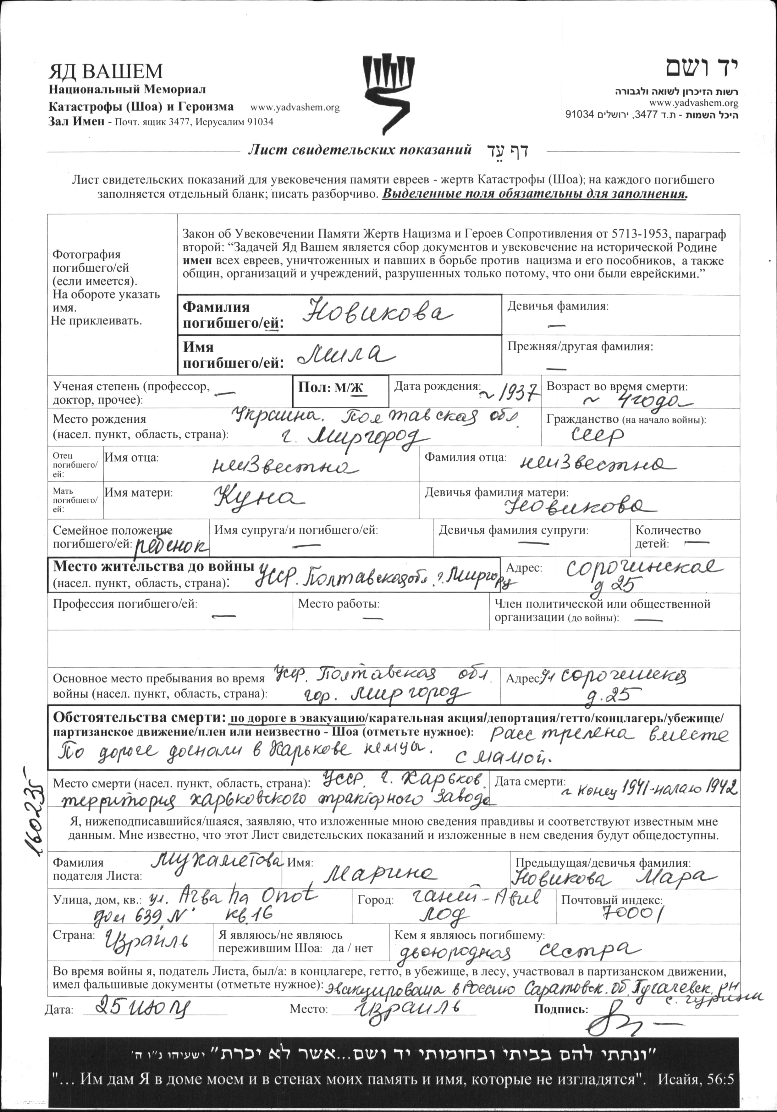 Mila Novikova wurde im Jahr 1937 in Mirgorod, Ukraine (UdSSR) geboren. Sie war die Tochter von Kuna. Sie war Kind. Vor dem Zweiten Weltkrieg lebte sie in Mirgorod, Ukraine (UdSSR). Während des Krieges war sie in Mirgorod, Ukraine (UdSSR).