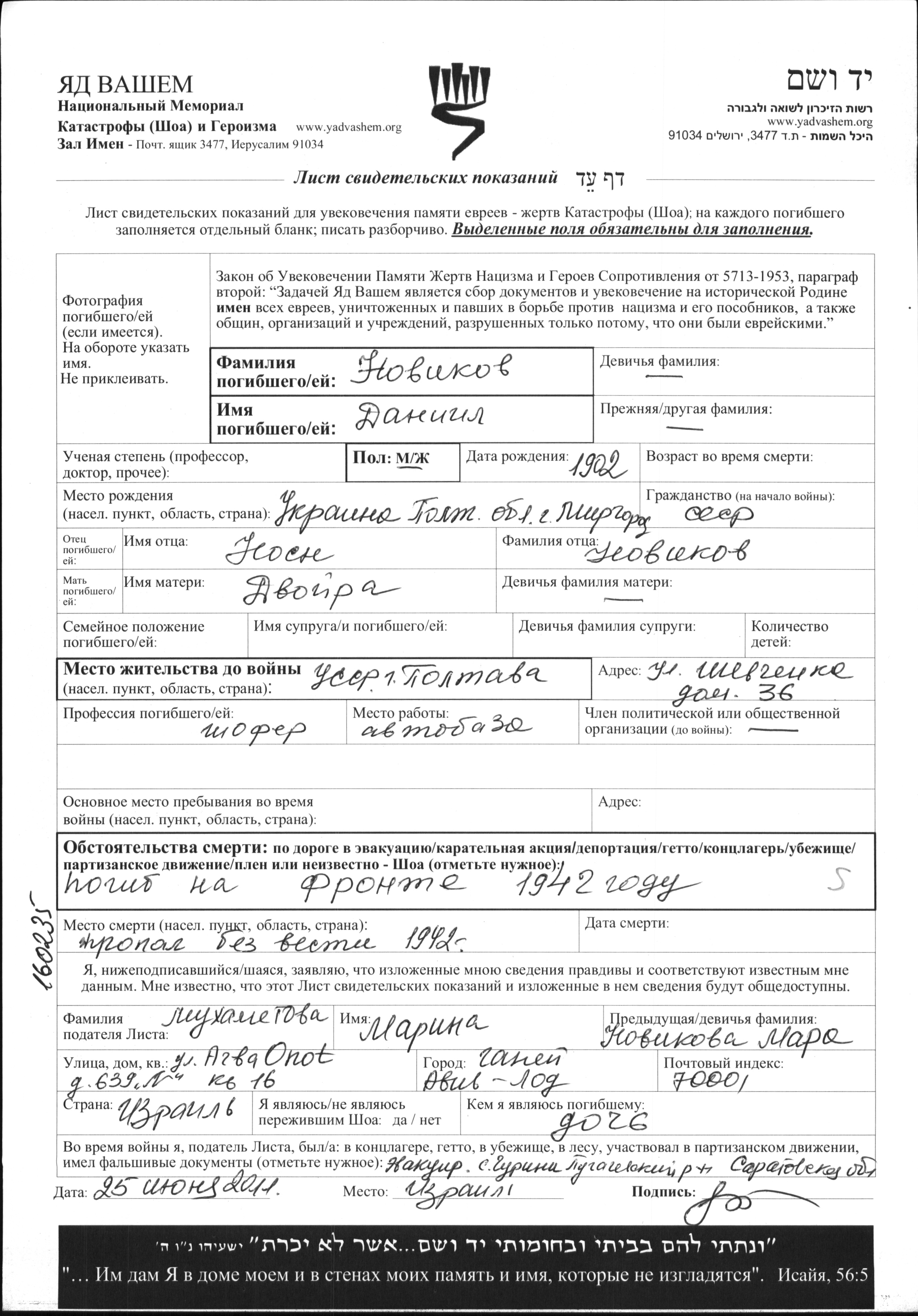 Daniil Novikov wurde im Jahr 1902 in Mirgorod, Ukraine (UdSSR) geboren. Er war der Sohn von Nosn und Dvoyra. Er war Chauffeur. Vor dem Zweiten Weltkrieg lebte er in Poltava, Ukraine (UdSSR). Während des Krieges war er in die Sowjetischen Streitkräfte.