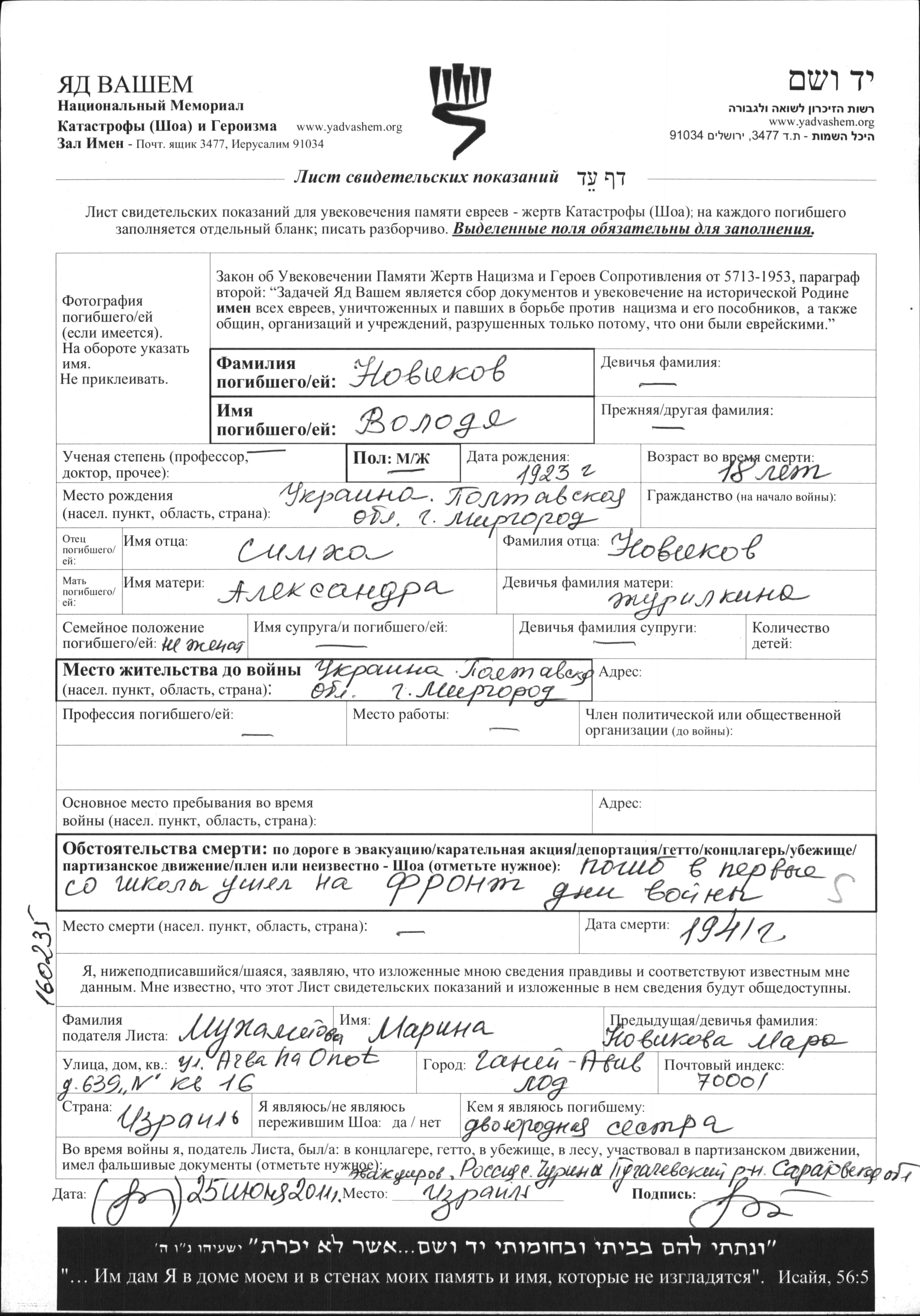 Volodya Novikov wurde im Jahr 1923 in Mirgorod, Ukraine (UdSSR) geboren. Er war der Sohn von Simkha und Aleksandra, geb. Turilkina. Er war Ledig. Vor dem Zweiten Weltkrieg lebte er in Mirgorod, Ukraine (UdSSR). Während des Krieges war er in die Sowjetischen Streitkräfte. Volodya im Militärdienst umgekommen. Todesort: unbekannt im Jahr 1941.