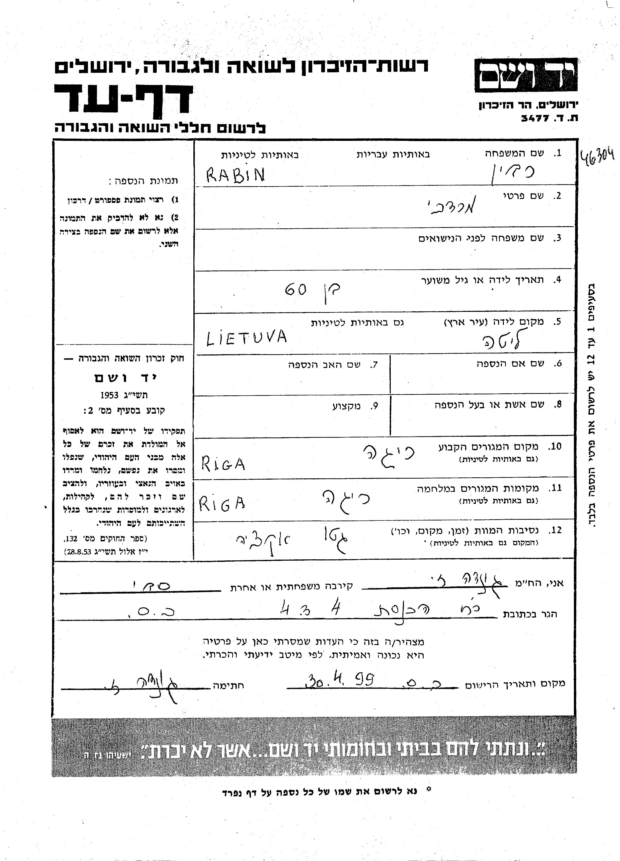Rabin Mordekhai Riga, Lettland Gedenkblatt