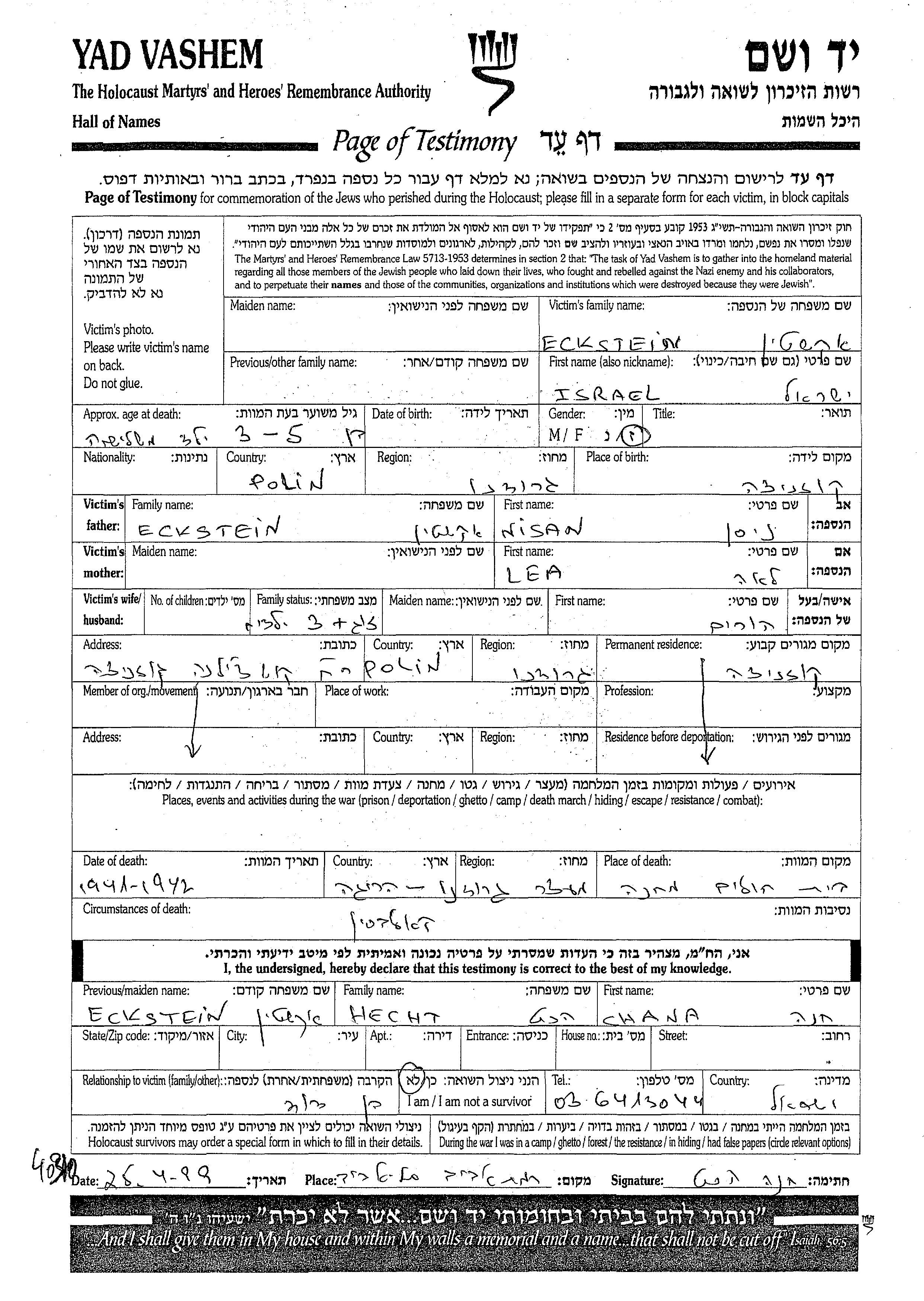 Israel Eckstein wurde in Kuznica, Polen geboren. Er war der Sohn von Nisan und Lea. Er war Kind. Während des Krieges war er in Kuznica, Polen.