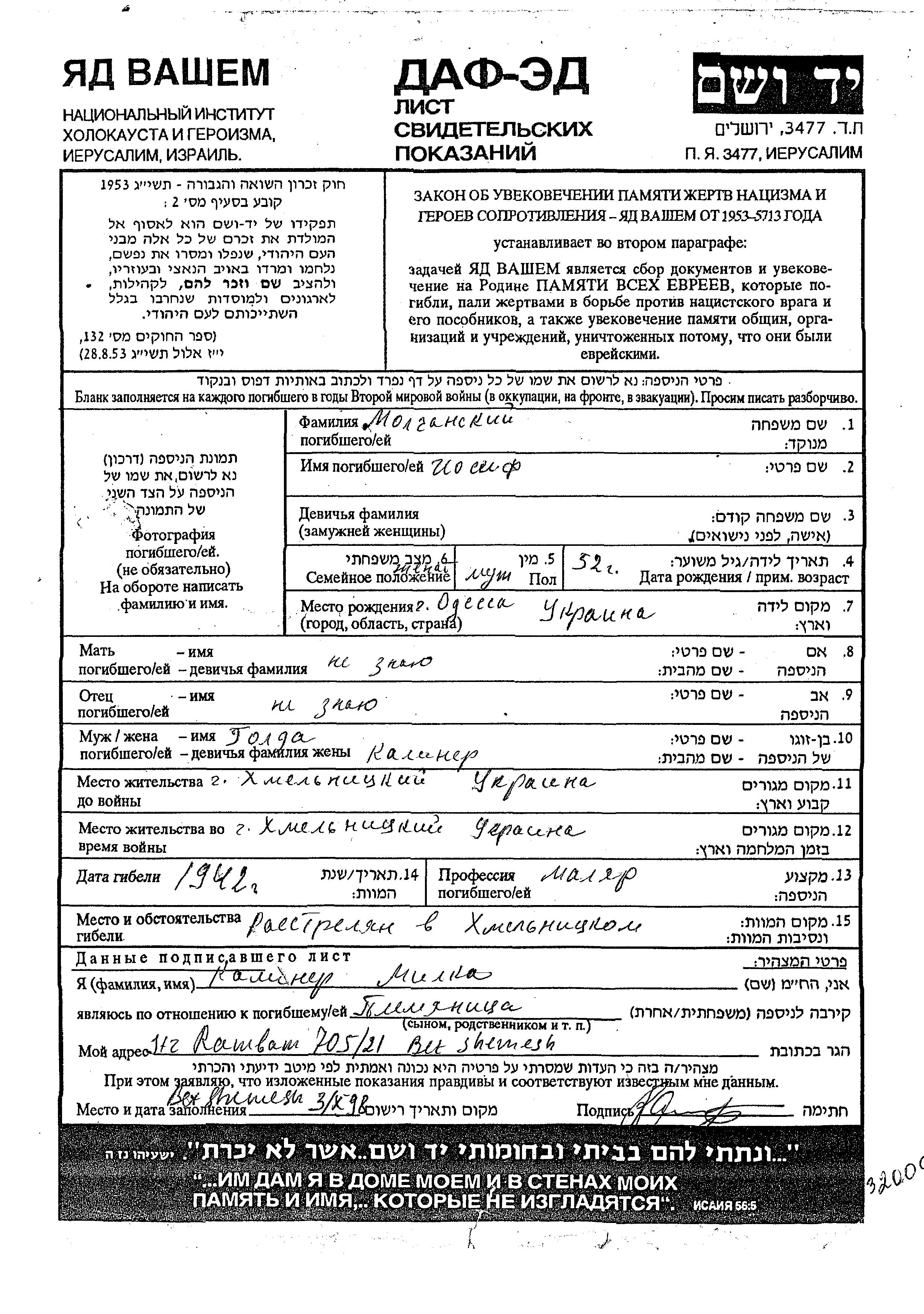 Iosif Molchanski wurde in Odessa, Ukraine (UdSSR) geboren. Er war Anstreicher/-in und mit Golda, geb. Kaliner Verheiratet. Vor dem Zweiten Weltkrieg lebte er in Khmelnitski, Ukraine (UdSSR). Während des Krieges war er in Khmelnitski, Ukraine (UdSSR).