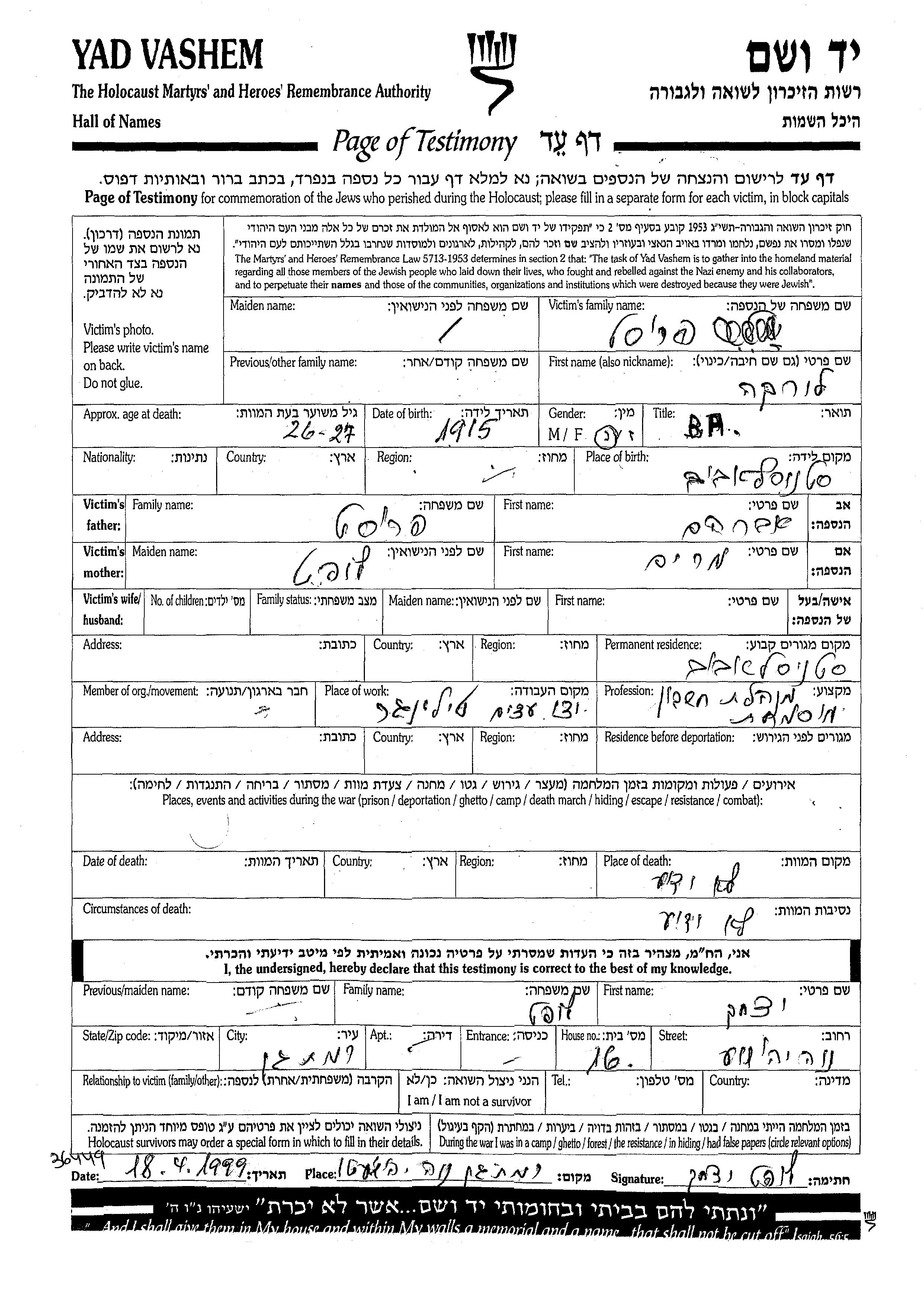 Laura Frost wurde im Jahr 1915 in Stanislawow, Polen geboren. Sie war die Tochter von Avraham und Miriam. Sie war Buchhalter/-in. Vor dem Zweiten Weltkrieg lebte sie in Stanislawow, Polen.