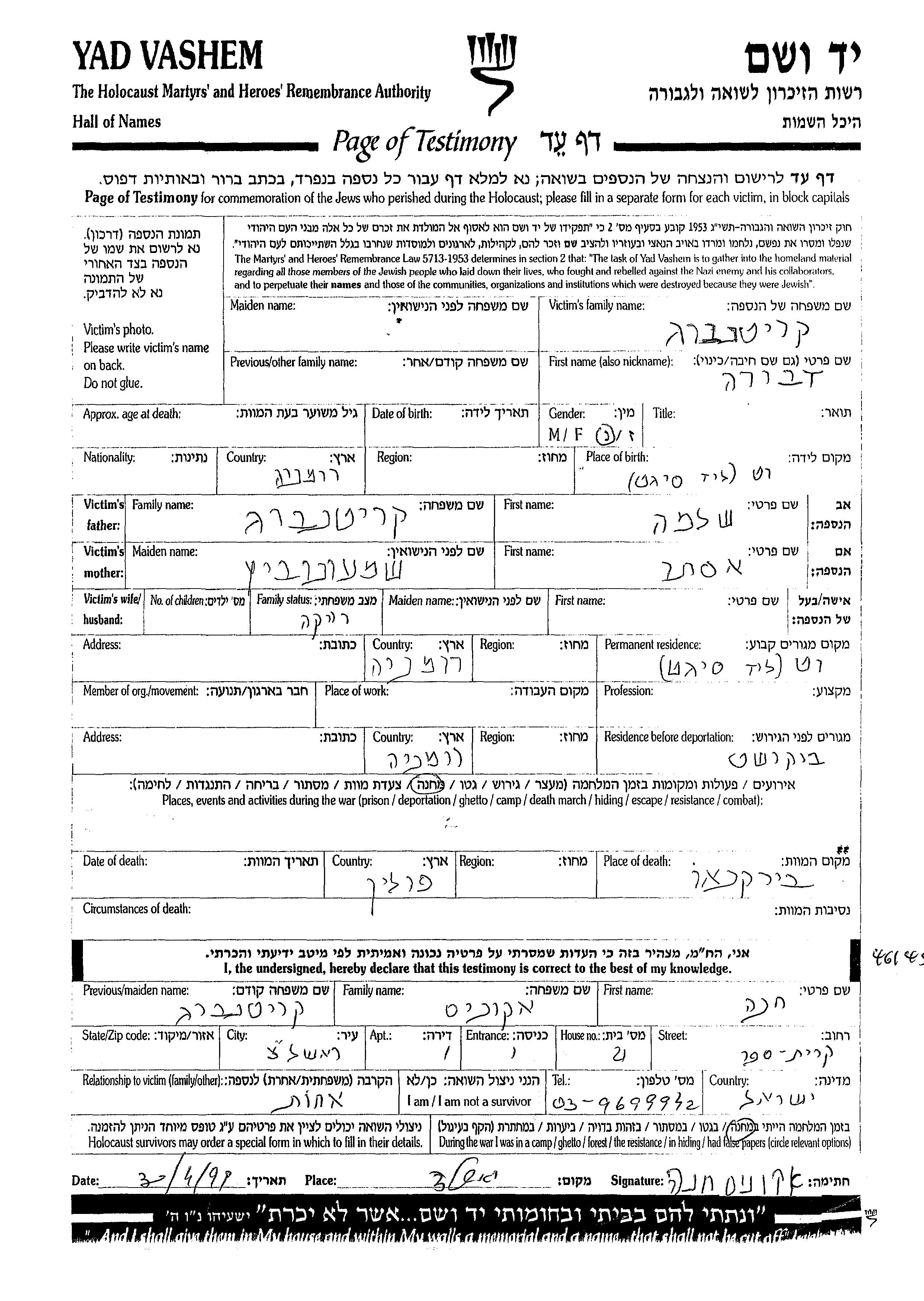 Dvora wurde in der Schoah ermordet. Todesort: Birkenau, Polen.