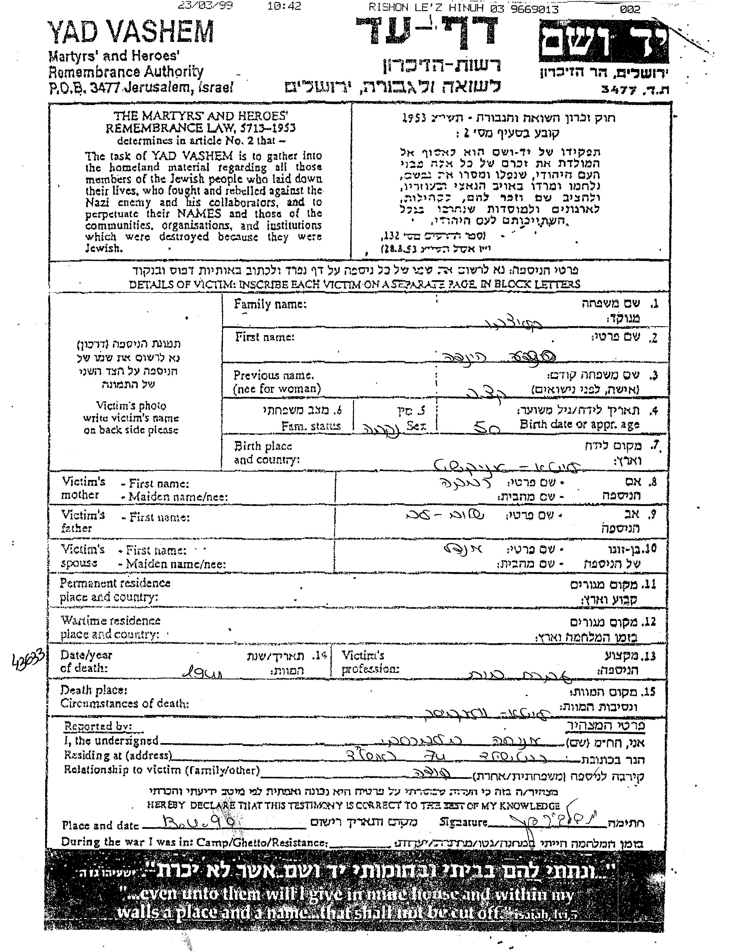 Hinde wurde in der Schoah ermordet. Todesort: Wolkowysk, Polen im Jahr 1941.