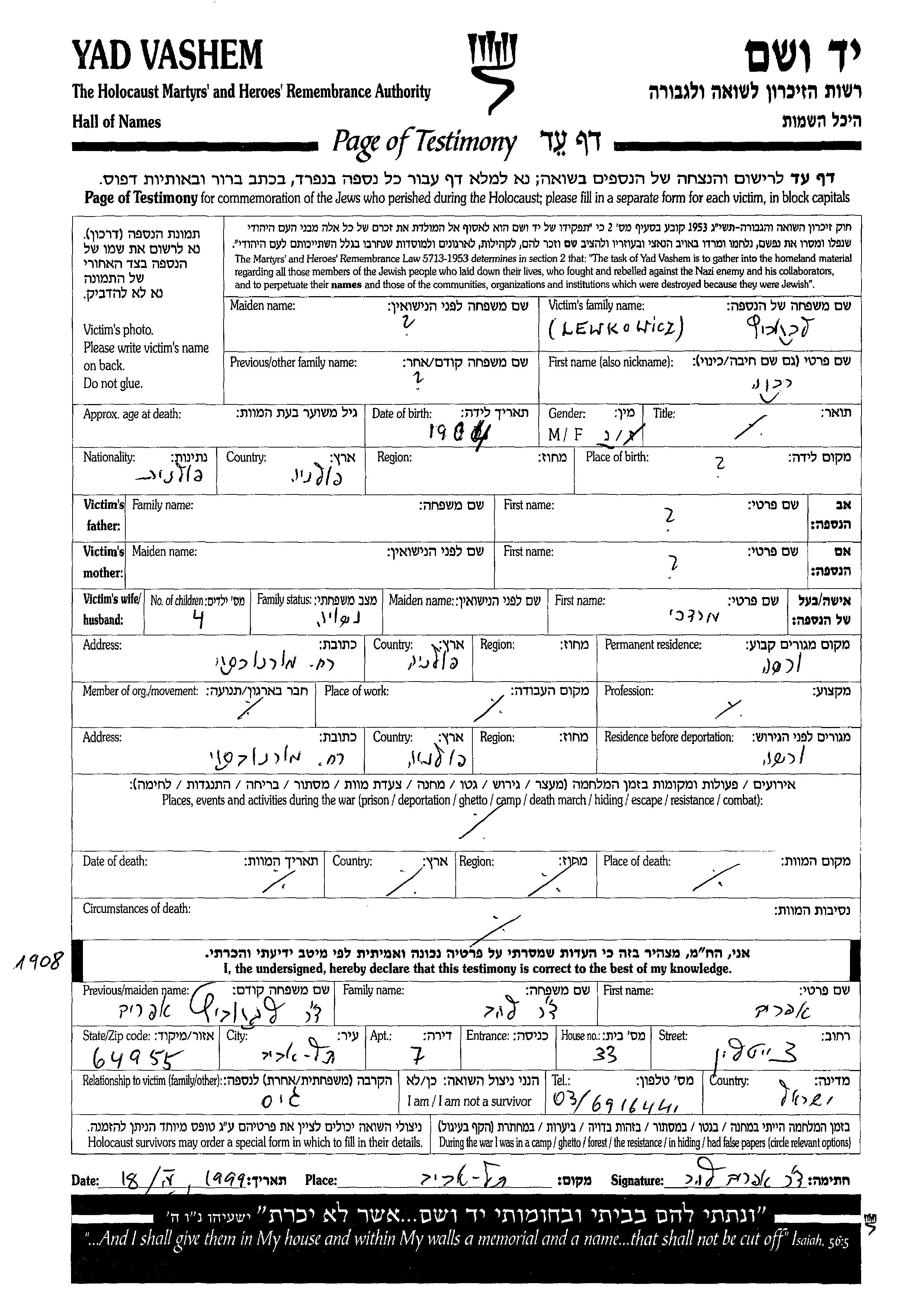 Lewkowicz Rivka 1904 Warsaw, Polen Gedenkblatt