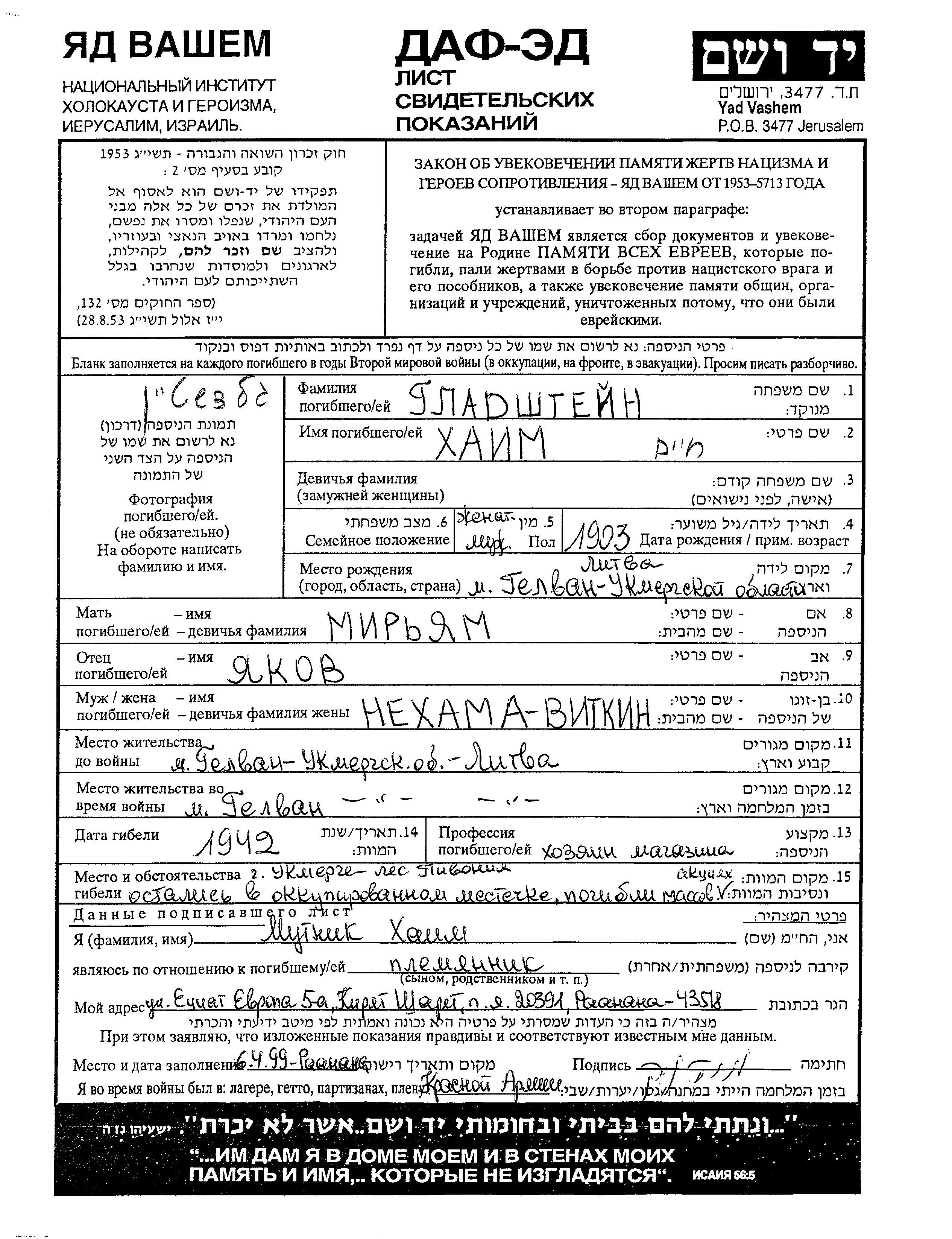 Khaim wurde in der Schoah ermordet. Todesort: Gelvan, Litauen im Jahr 1942.