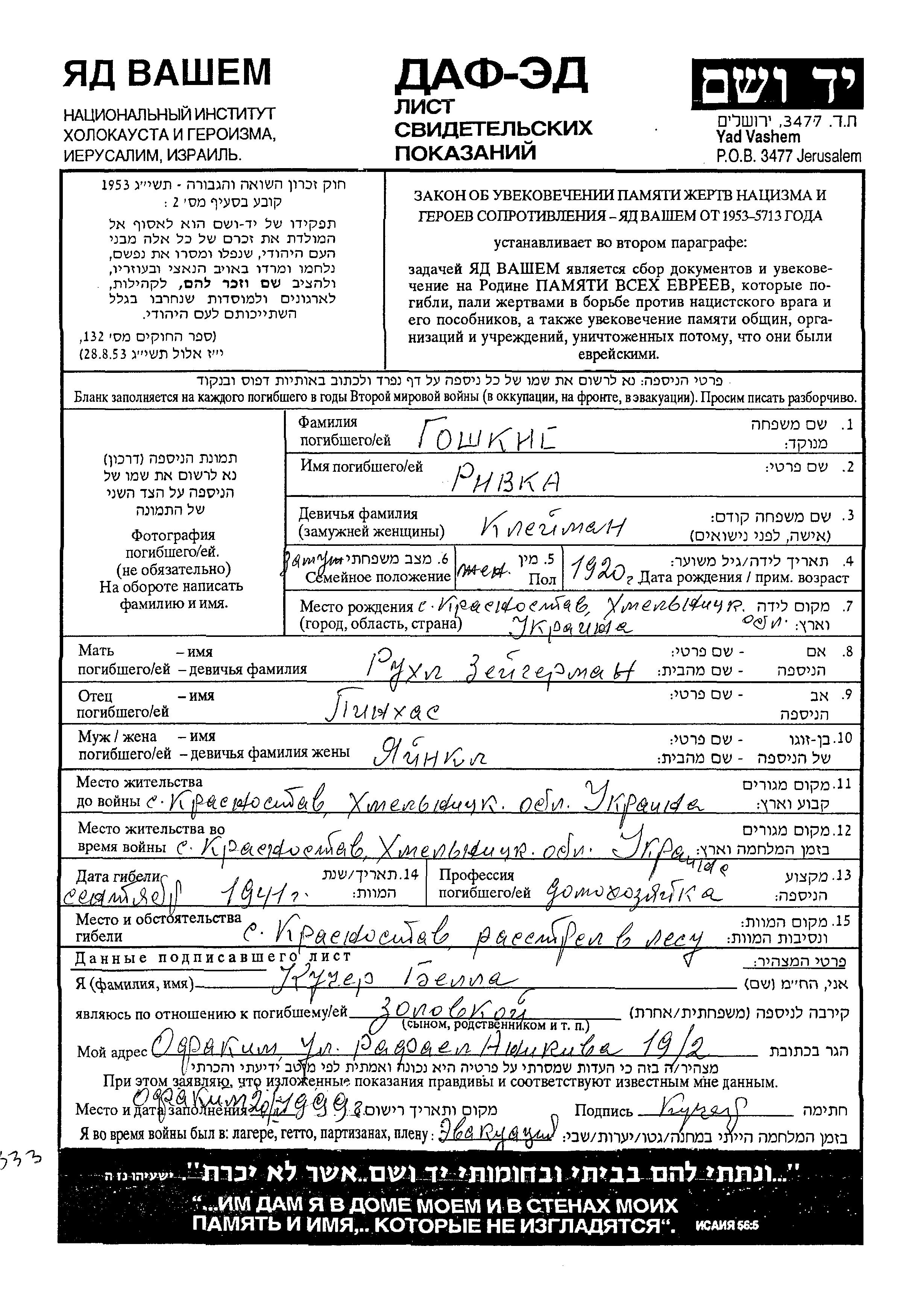 Goshkis Rivka 1920 Krasnostav, Ukraine (UdSSR) Gedenkblatt