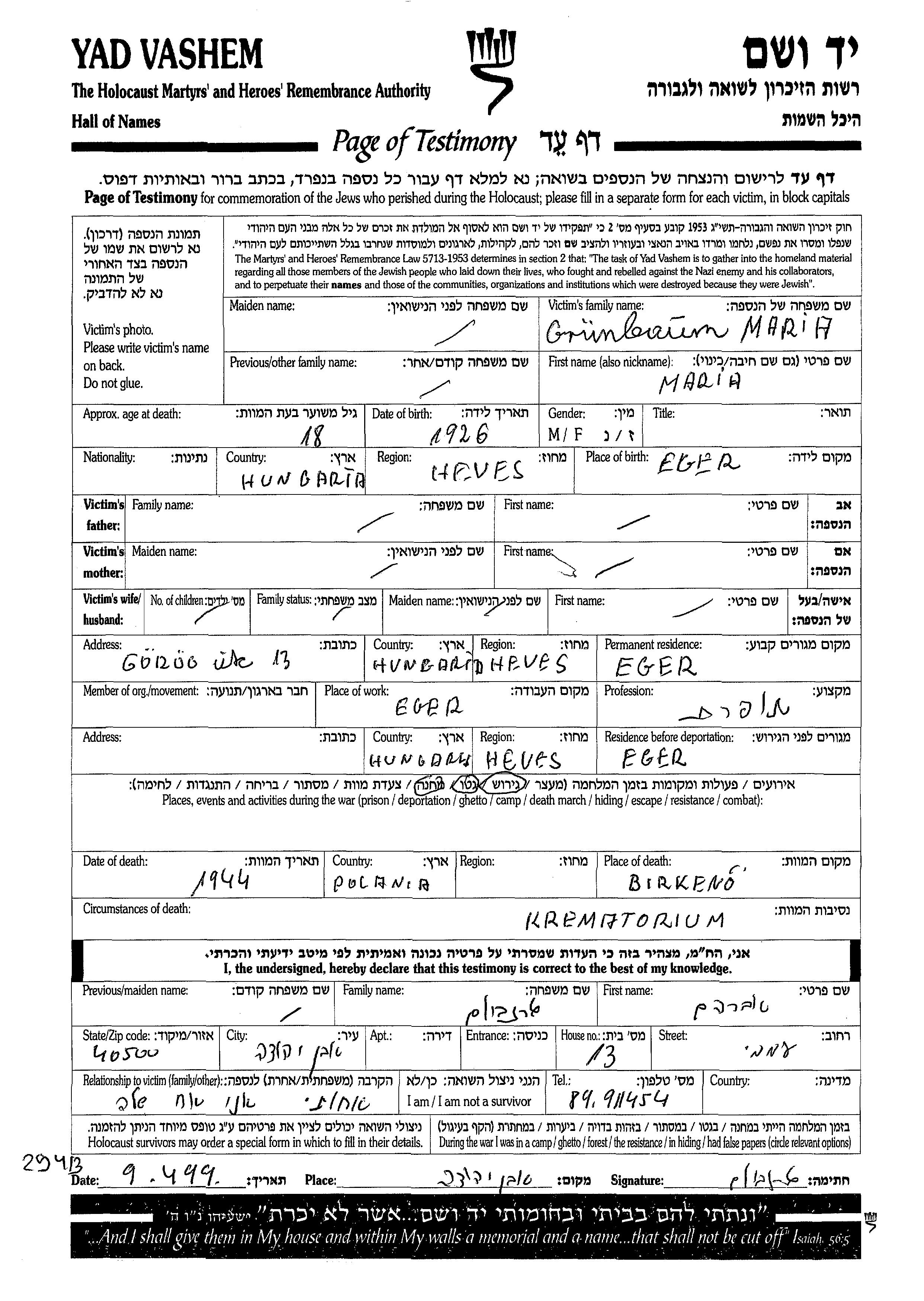 Maria Grunbaum wurde im Jahr 1926 in Eger, Ungarn geboren. Sie war Schneiderin. Vor dem Zweiten Weltkrieg lebte sie in Eger, Ungarn. Während des Krieges war sie in Eger, Ungarn.