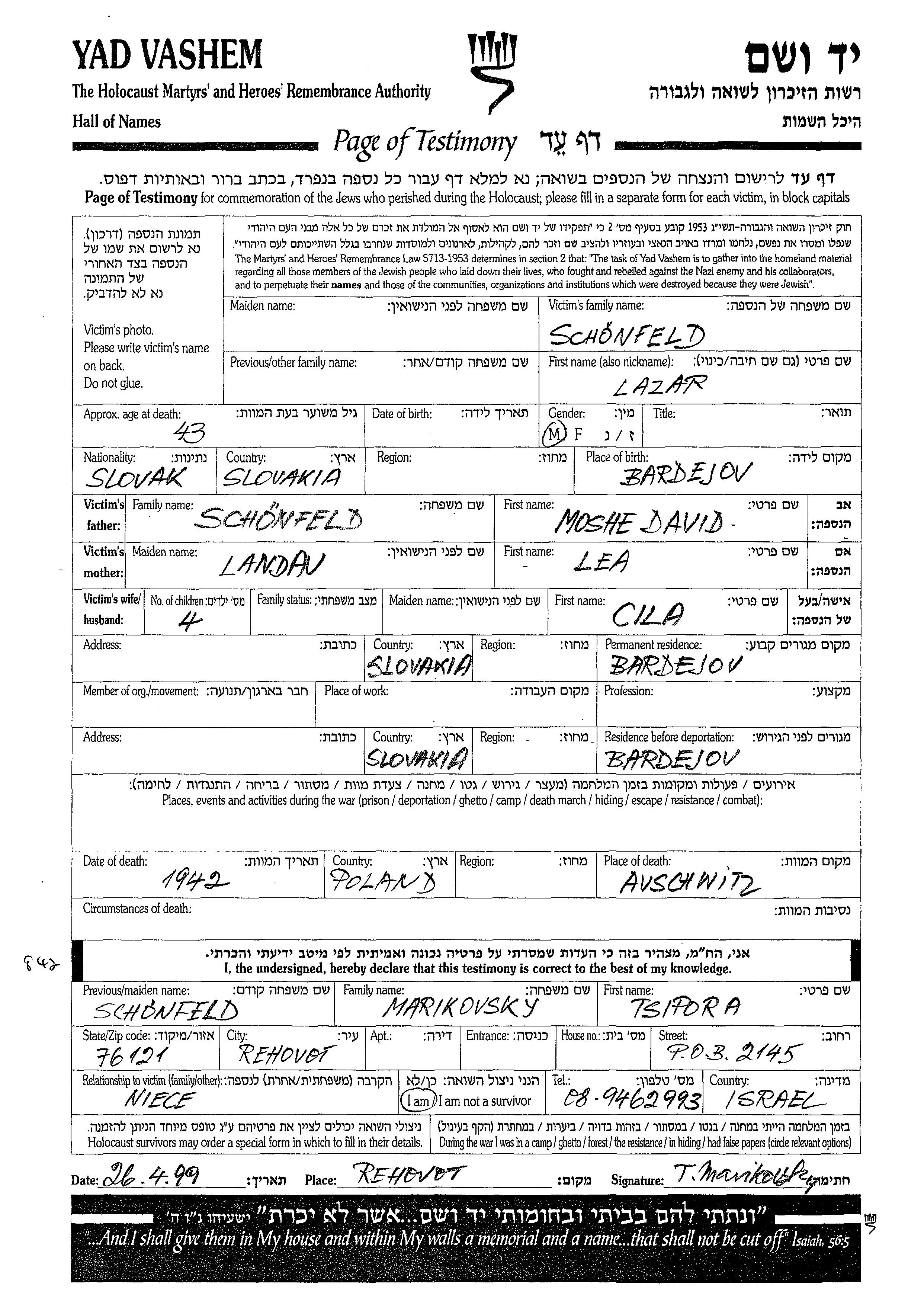 Lazar Schonfeld wurde in Bardejov, Tschechoslowakei geboren. Er war der Sohn von Moshe David und Lea. Er war mit Cila Verheiratet. Vor dem Zweiten Weltkrieg lebte er in Bardejov, Tschechoslowakei. Während des Krieges war er in Bardejov, Tschechoslowakei.