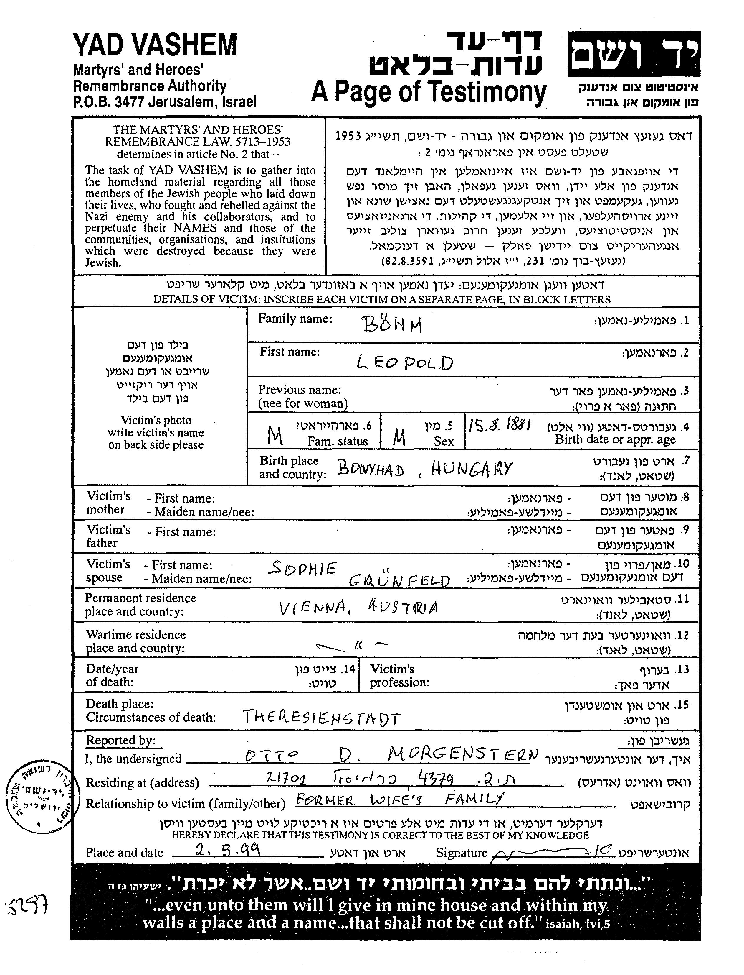 Leopold Bohm wurde im Jahr 1881 in Bonyhad, Ungarn geboren. Er war mit Sophie, geb. Grunfeld Verheiratet. Vor dem Zweiten Weltkrieg lebte er in Vienna, Österreich. Während des Krieges war er in Vienna, Österreich.