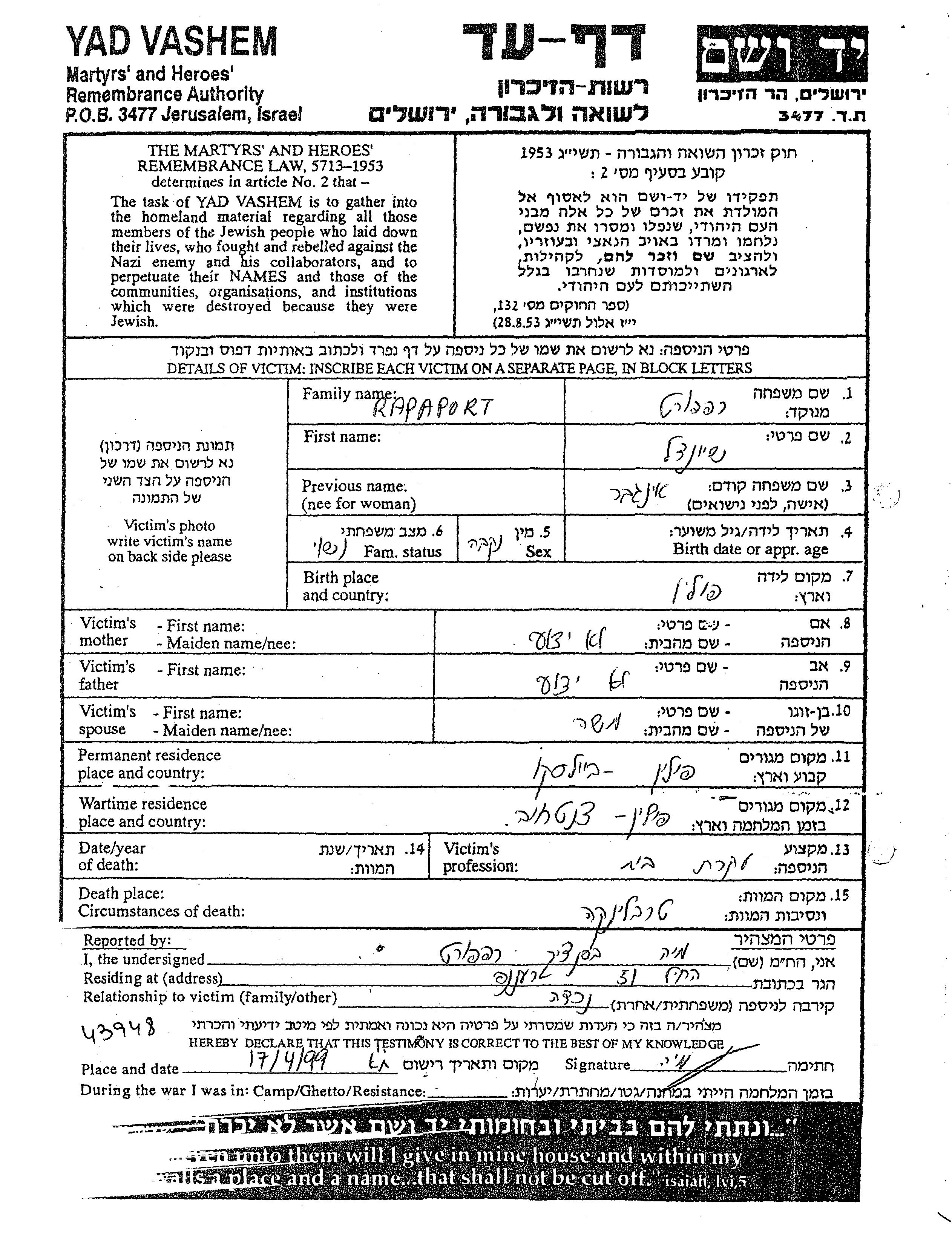 Sheindl Rapaport, geb. Ingber wurde in Polen geboren. Sie war Hausfrau und mit Moshe Verheiratet. Vor dem Zweiten Weltkrieg lebte sie in Bielsko, Polen. Während des Krieges war sie in Czestchow, Polen.