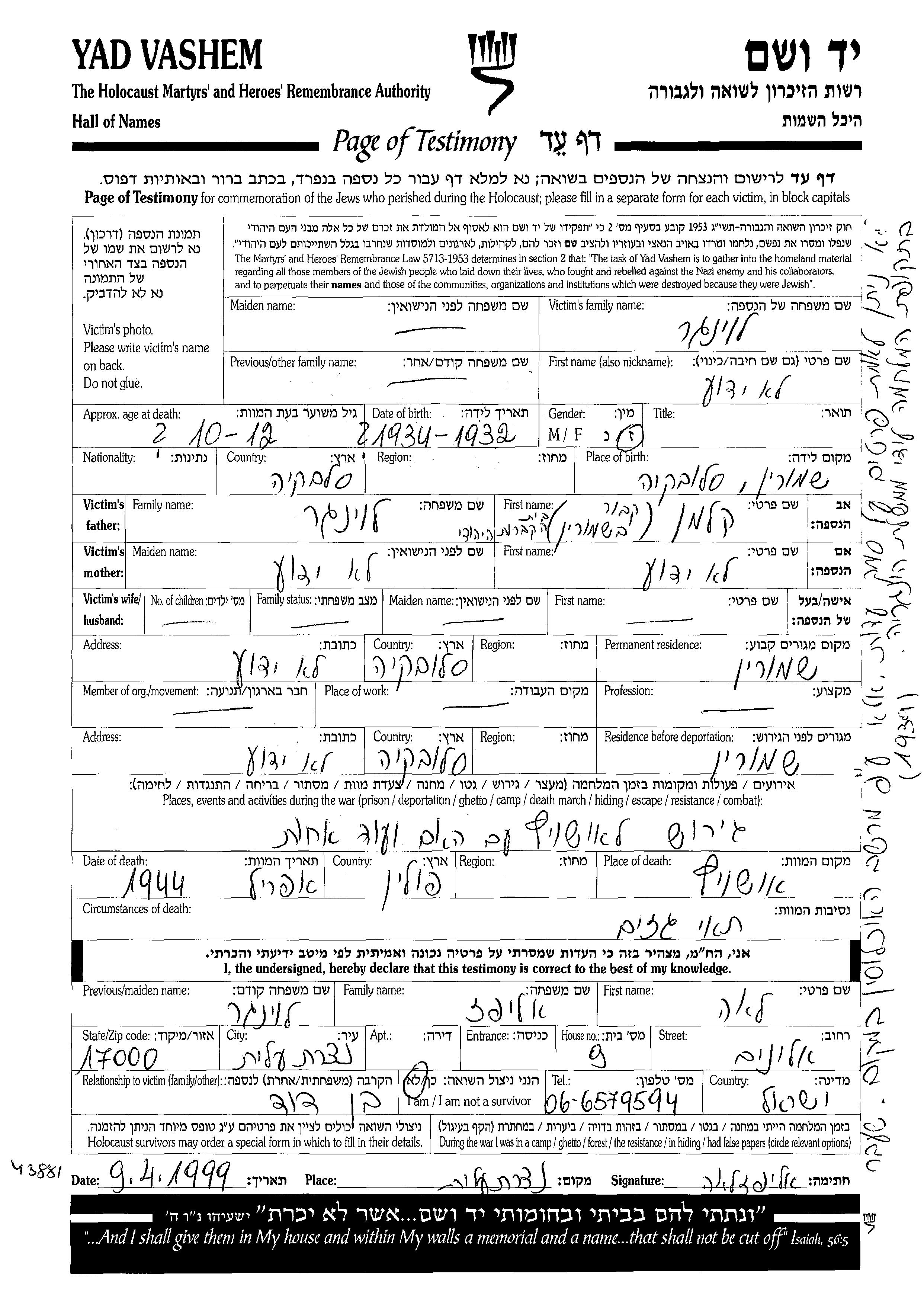 Er wurde in der Schoah ermordet. Todesort: Auschwitz, Polen im Jahr 04/1944.