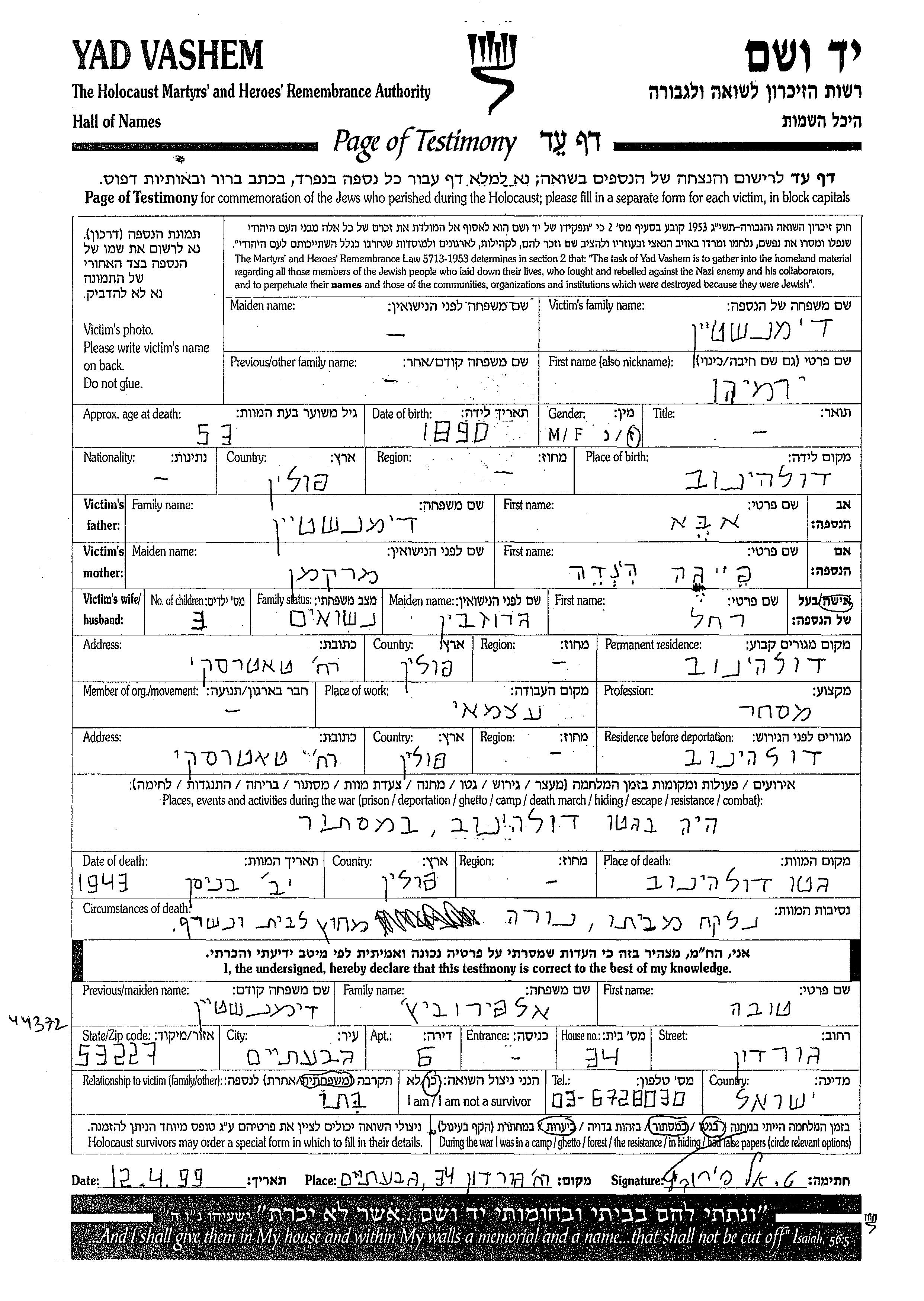 Yermiyahu wurde in der Schoah ermordet. Todesort: Dolhinow, Polen im Jahr 1943.