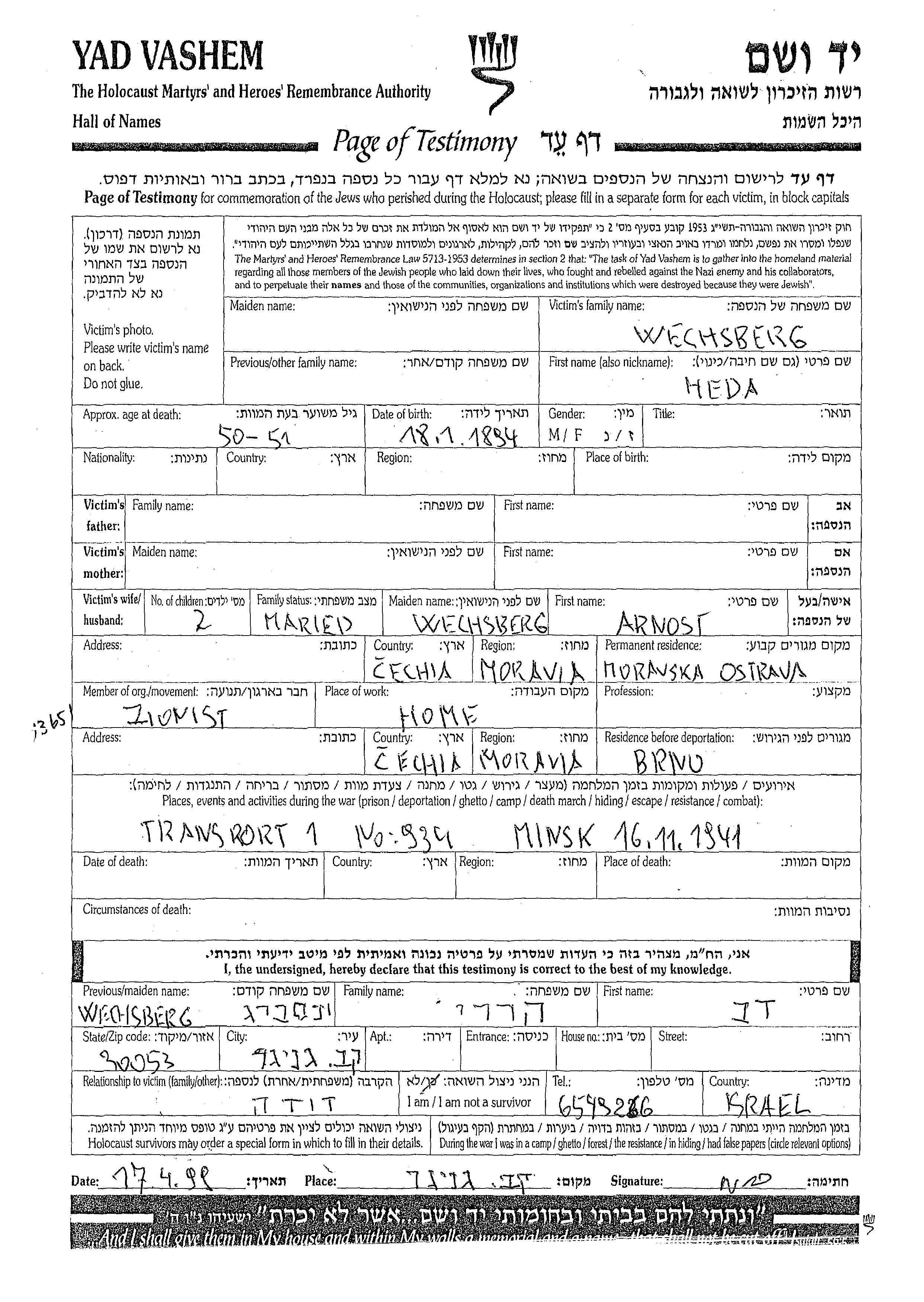 Heda Wechsberg wurde im Jahr 1894 geboren. Sie war mit Arnost Verheiratet. Vor dem Zweiten Weltkrieg lebte sie in Moravska Ostrava, Tschechoslowakei. Während des Krieges war sie in Brno, Tschechoslowakei.