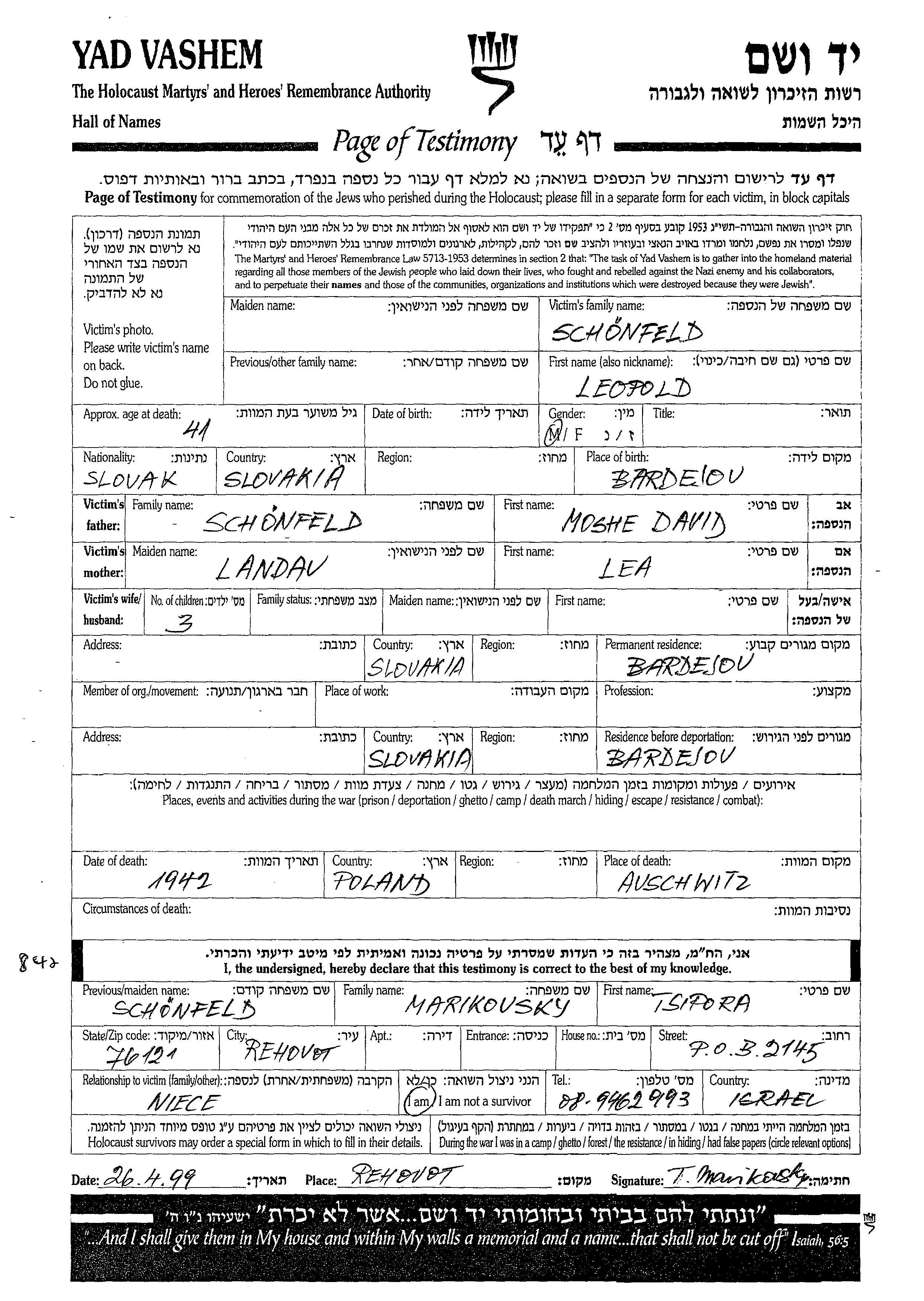 Leopold Schonfeld wurde in Bardejov, Tschechoslowakei geboren. Er war der Sohn von Moshe David und Lea. Er war Verheiratet. Vor dem Zweiten Weltkrieg lebte er in Bardejov, Tschechoslowakei. Während des Krieges war er in Bardejov, Tschechoslowakei.