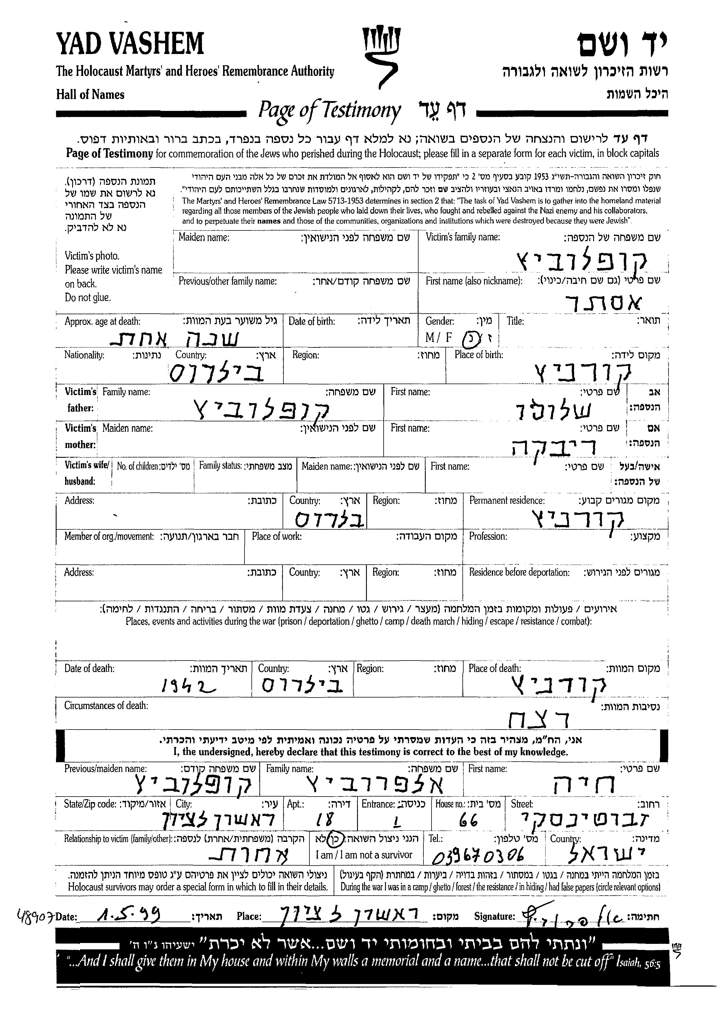 Ester wurde in der Schoah ermordet. Todesort: Korzeniec, Polen im Jahr 1942.