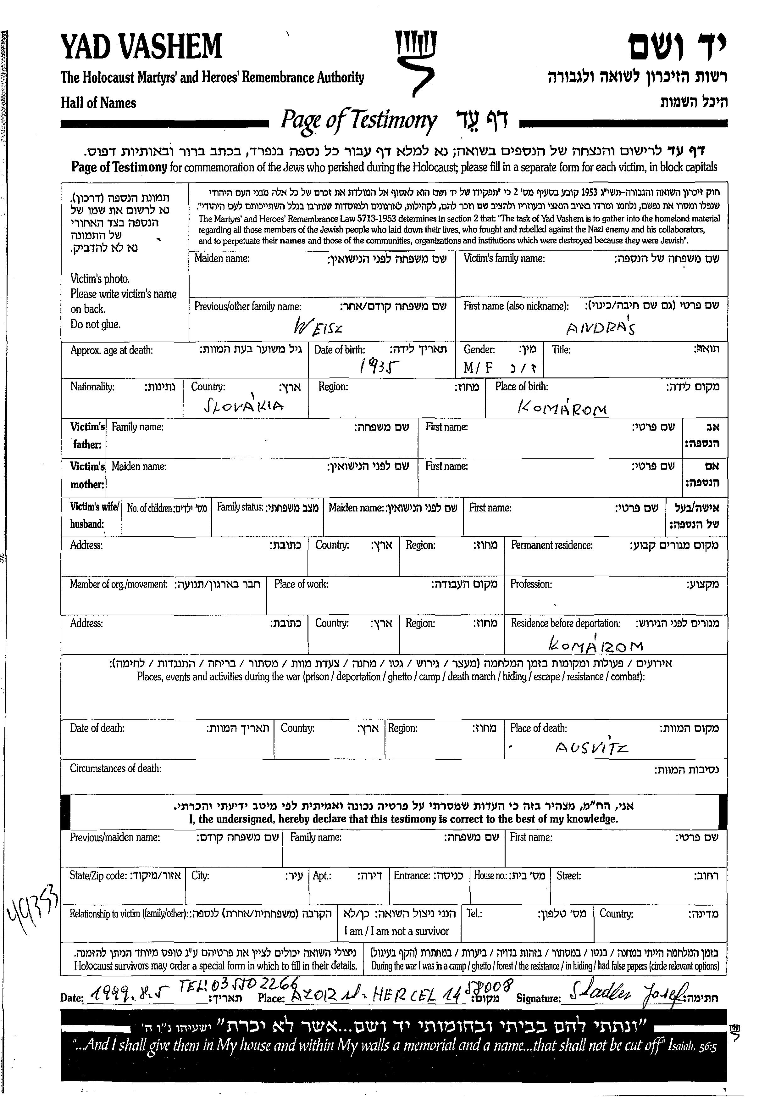 Andras wurde in der Schoah ermordet. Todesort: Auschwitz, Polen.