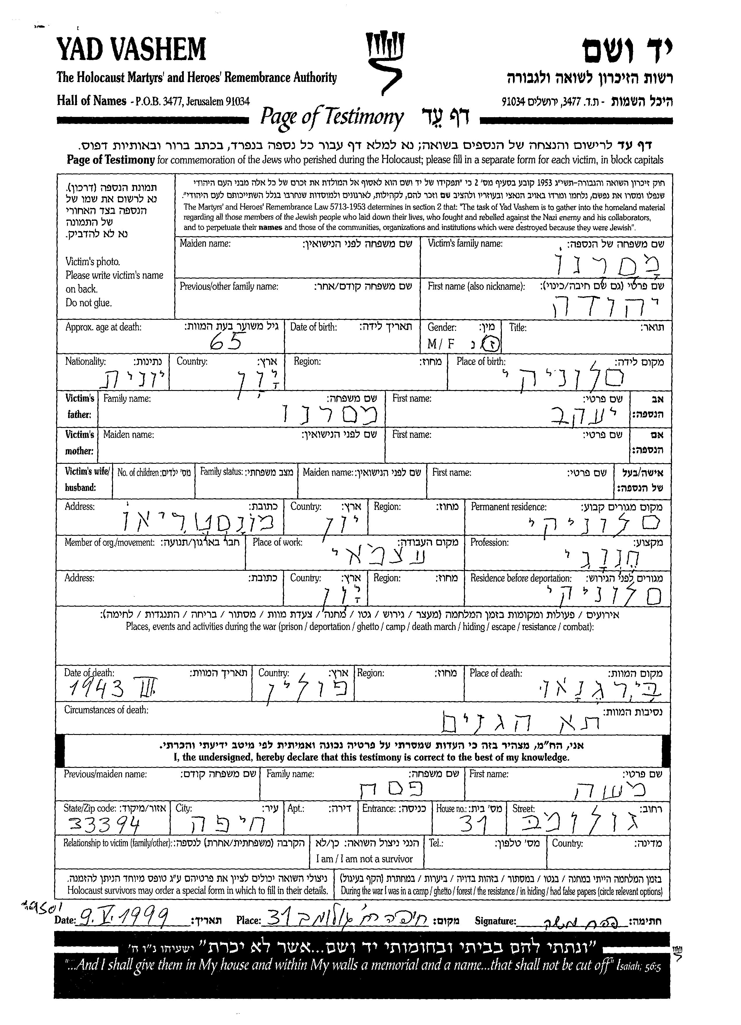 Yehuda wurde in der Schoah ermordet. Todesort: Birkenau, Polen im Jahr 03/1943.
