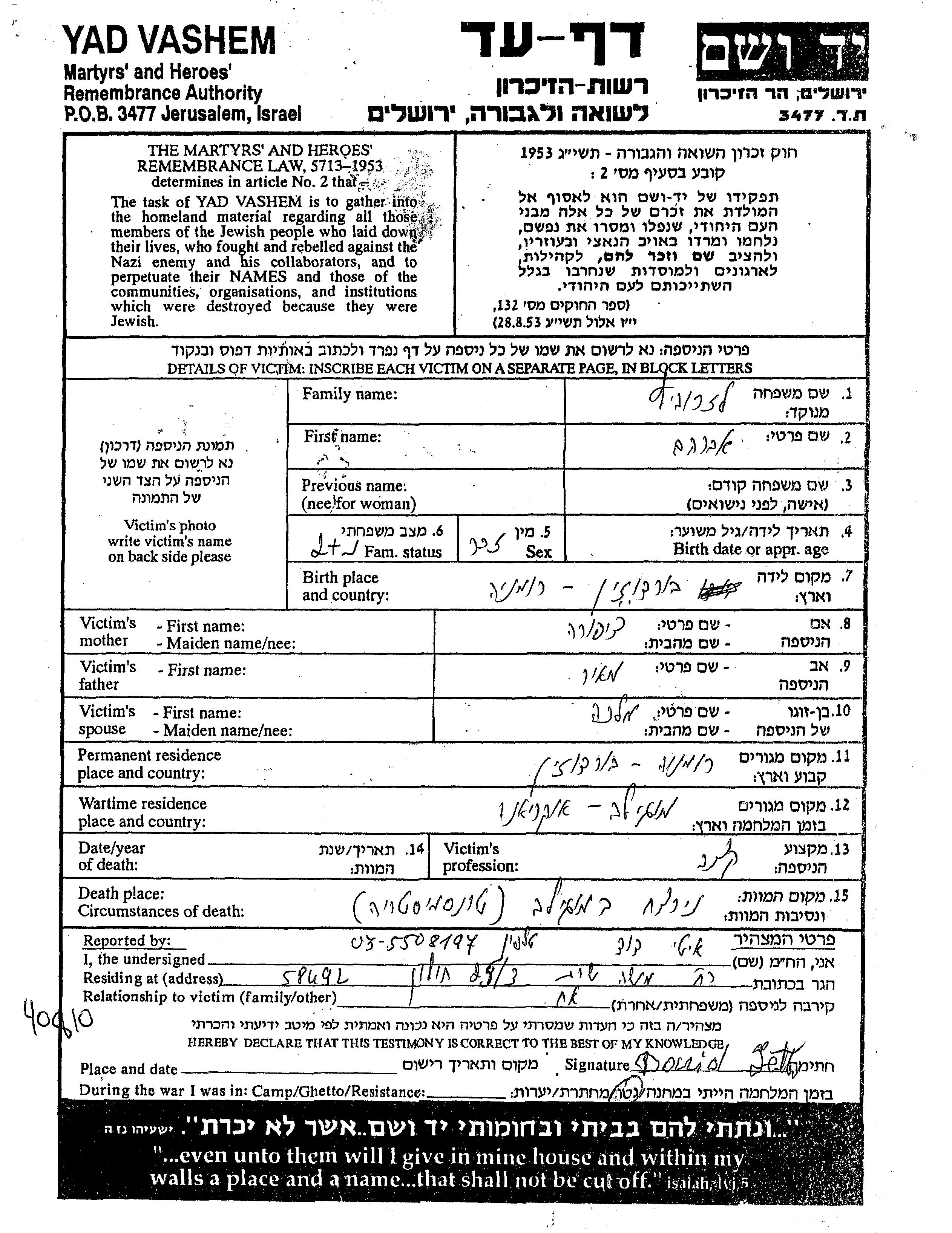 Avraham Lezerovitz wurde in Burdujeni, Rumänien geboren. Er war der Sohn von Meir und Tzipora. Er war Metzger/-in und mit Malka Verheiratet. Vor dem Zweiten Weltkrieg lebte er in Burdujeni, Rumänien. Während des Krieges war er in Mogilev, Ukraine (UdSSR). Avraham wurde in der Schoah ermordet. Todesort: Mogilev, Ukraine (UdSSR).