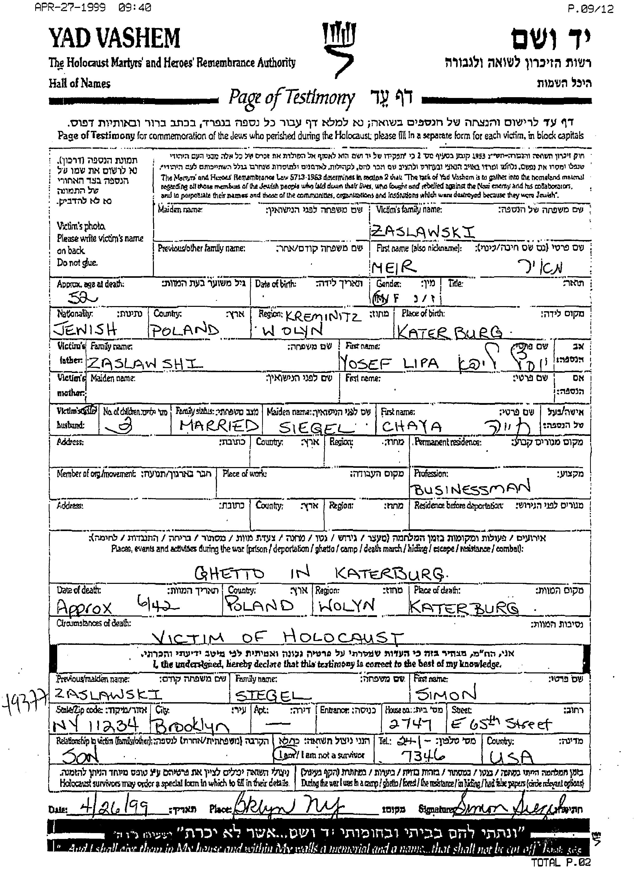 Meir Zaslawski wurde in Katerburg, Polen geboren. Er war der Sohn von Yosef Lipa. Er war Geschäftsmann und mit Chaya, geb. Siegel Verheiratet.