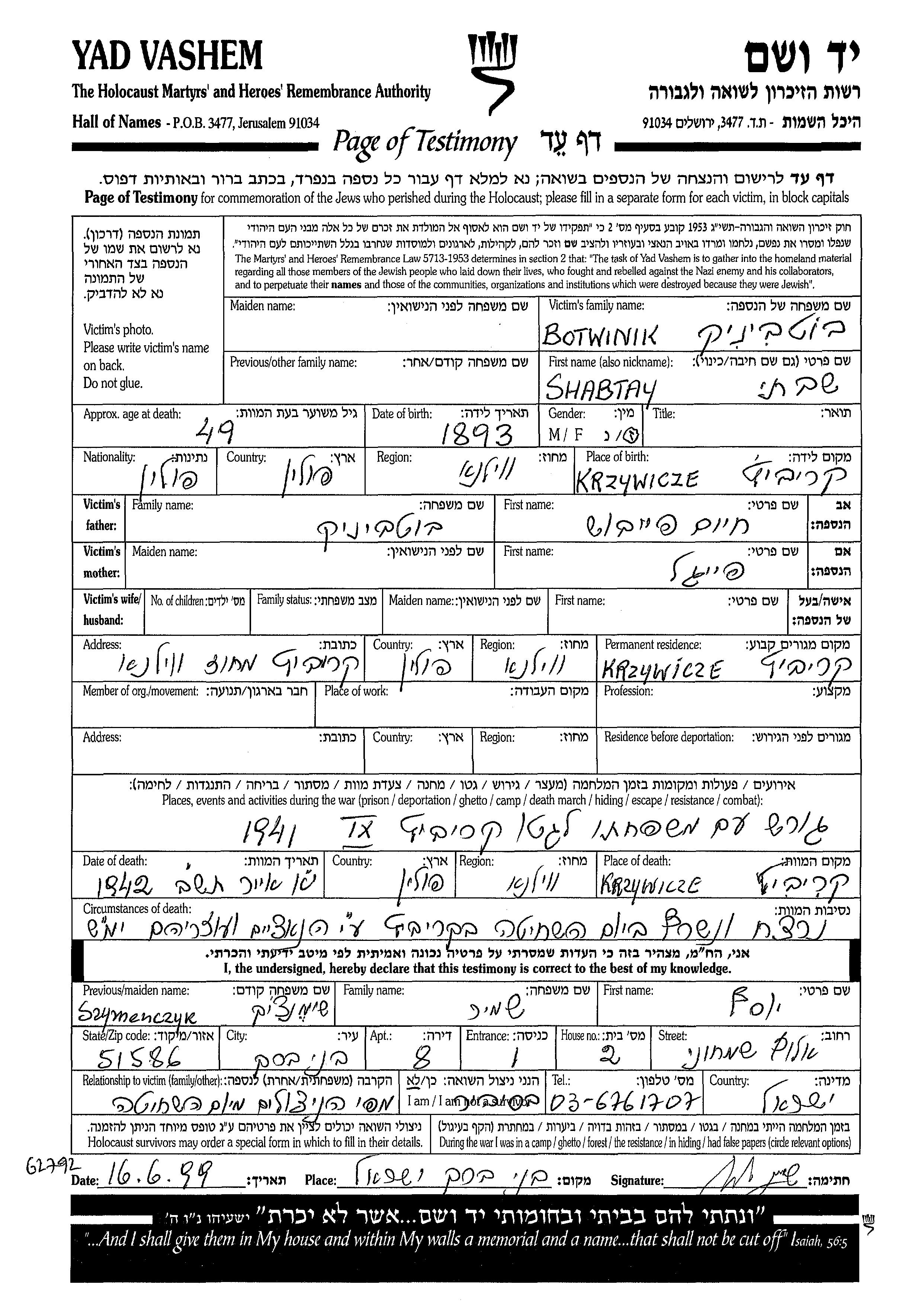 Shabtay Botwinik wurde im Jahr 1893 in Krzywicze, Polen geboren. Vor dem Zweiten Weltkrieg lebte er in Krzywicze, Polen. Shabtay wurde in der Schoah ermordet. Todesort: Krzywicze, Polen im Jahr 18/04/1942.