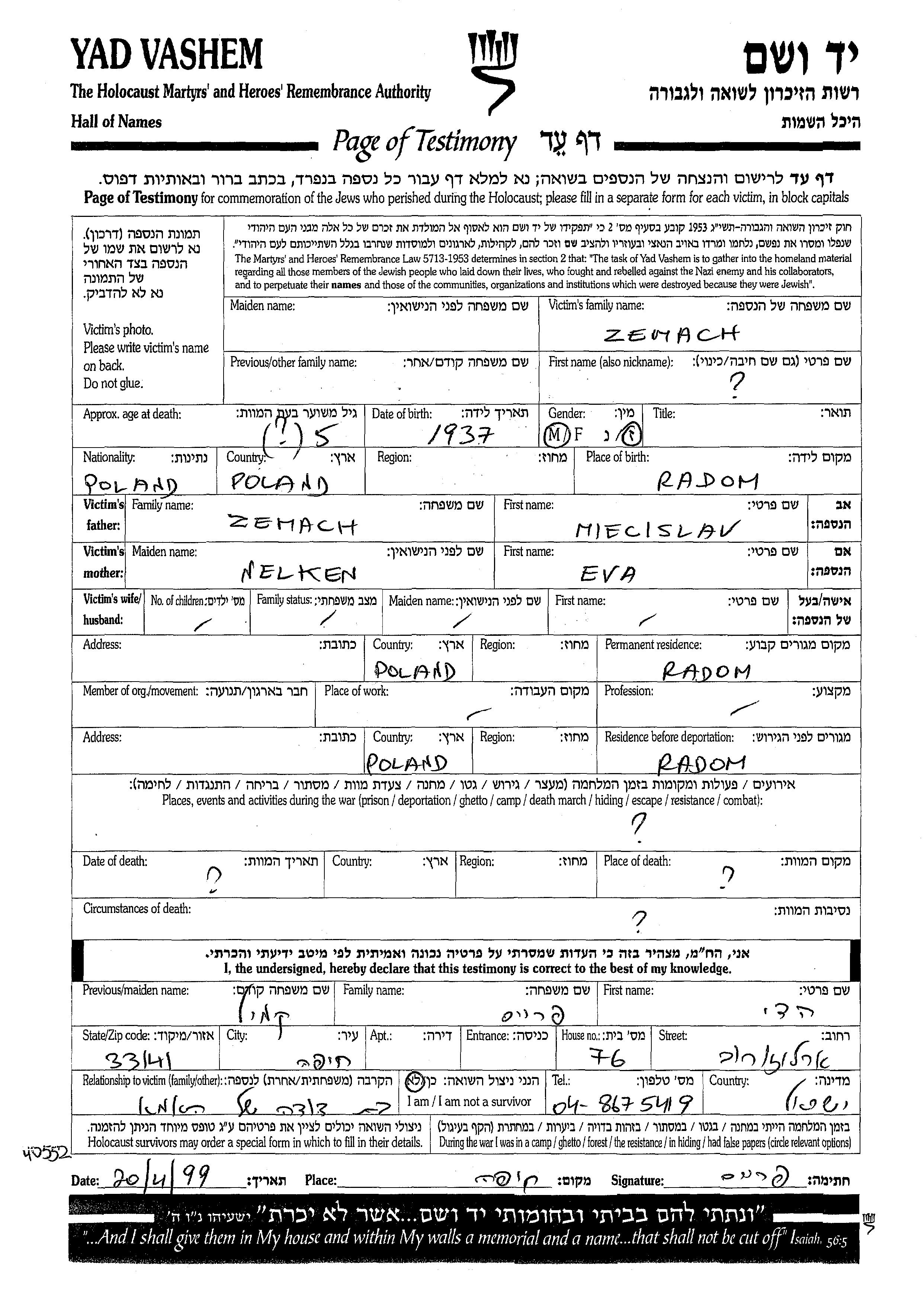 Vorname unbekannt Zemach wurde im Jahr 1937 in Radom, Polen geboren. Er war der Sohn von Miecislav und Eva. Vor dem Zweiten Weltkrieg lebte er in Radom, Polen. Während des Krieges war er in Radom, Polen.