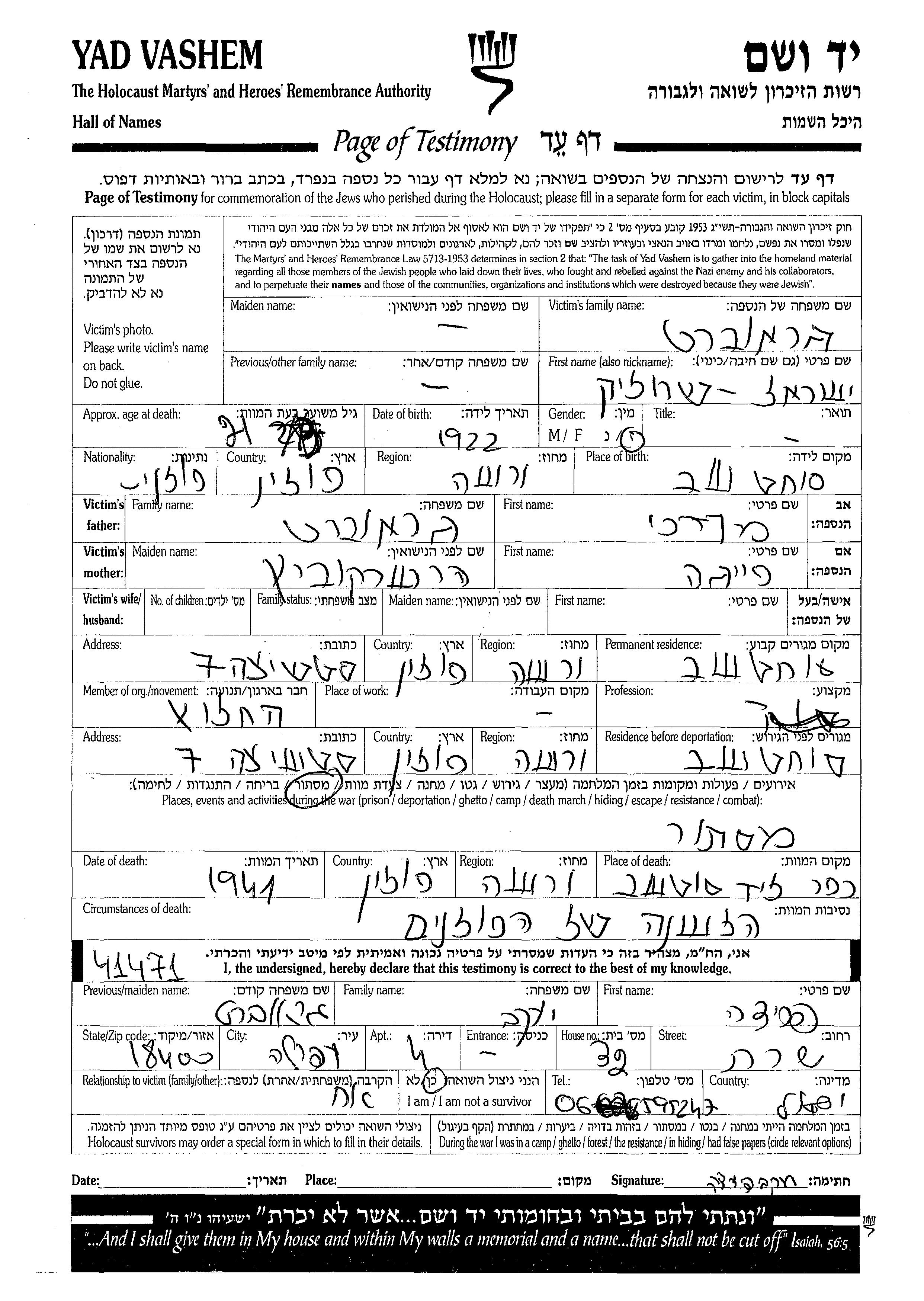 Yisrael wurde in der Schoah ermordet. Todesort: unbekannt im Jahr 1941.