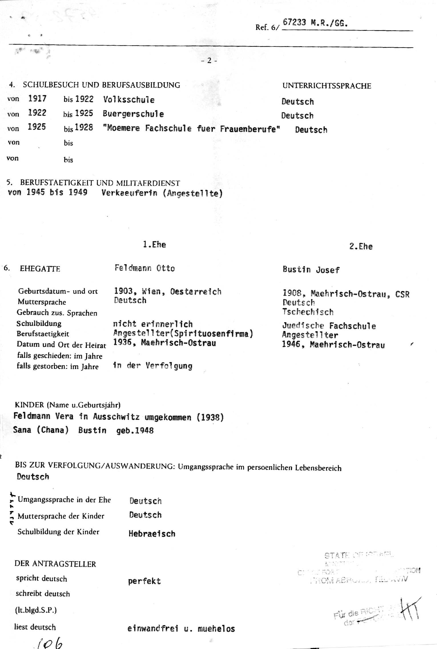 | Bustin | Joseph | Moravska Ostrava, Tschechoslowakei | Fragebogen für Überlebende und Flüchtlinge |
