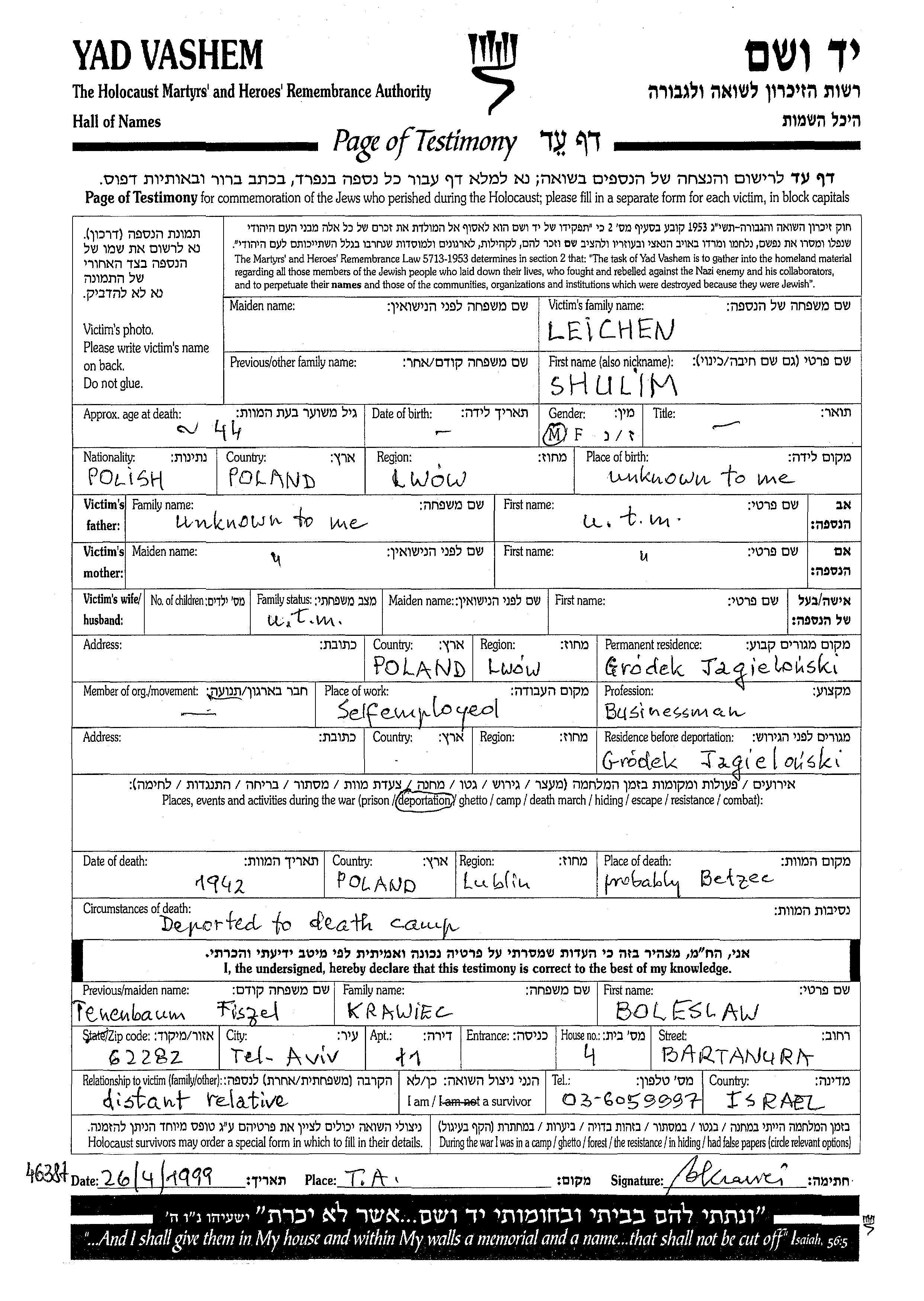 Shalom Leichen wurde in Lwow, Polen geboren. Er war Geschäftsmann. Vor dem Zweiten Weltkrieg lebte er in Grodek Jagiellonski, Polen. Während des Krieges war er in Grodek Jagiellonski, Polen.