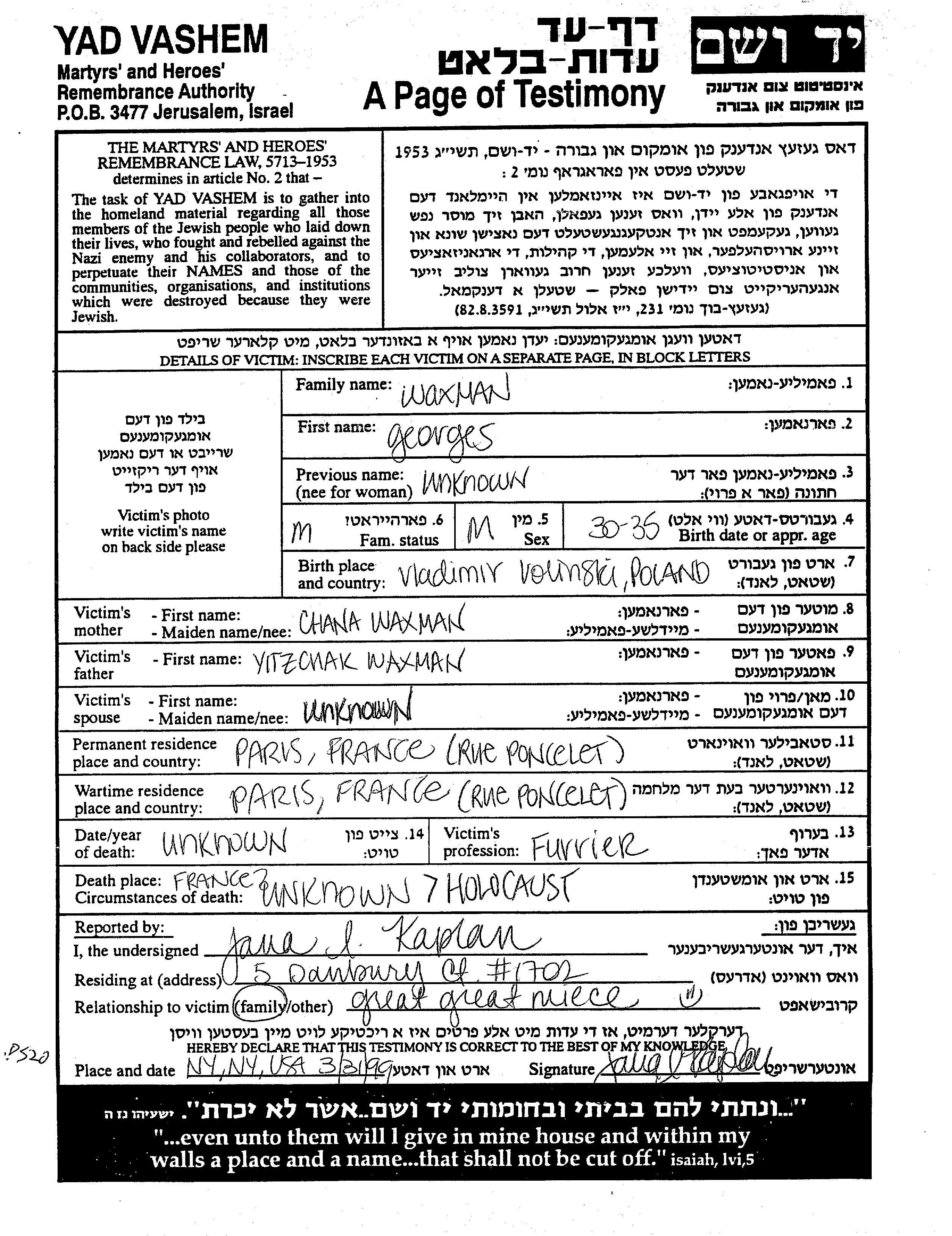 Georges Waxman wurde in Vladimir Volinski, Polen geboren. Er war der Sohn von Yitzchak und Chana. Er war Kürschner/-in. Vor dem Zweiten Weltkrieg lebte er in Paris, Frankreich. Während des Krieges war er in Paris, Frankreich.