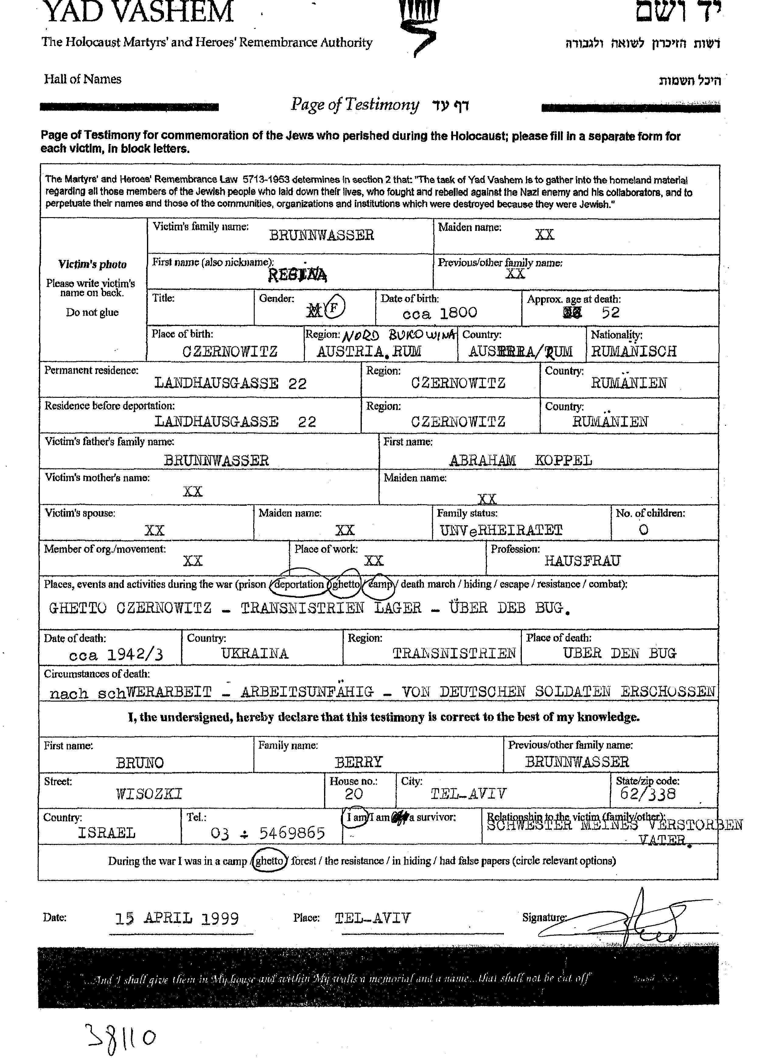 Regina Brunnwasser wurde im Jahr 1890 in Czernowitz, Rumänien geboren. Sie war die Tochter von Abraham Koppel. Sie war Hausfrau und Ledig. Vor dem Zweiten Weltkrieg lebte sie in Czernowitz, Rumänien. Während des Krieges war sie in Czernowitz, Rumänien.
