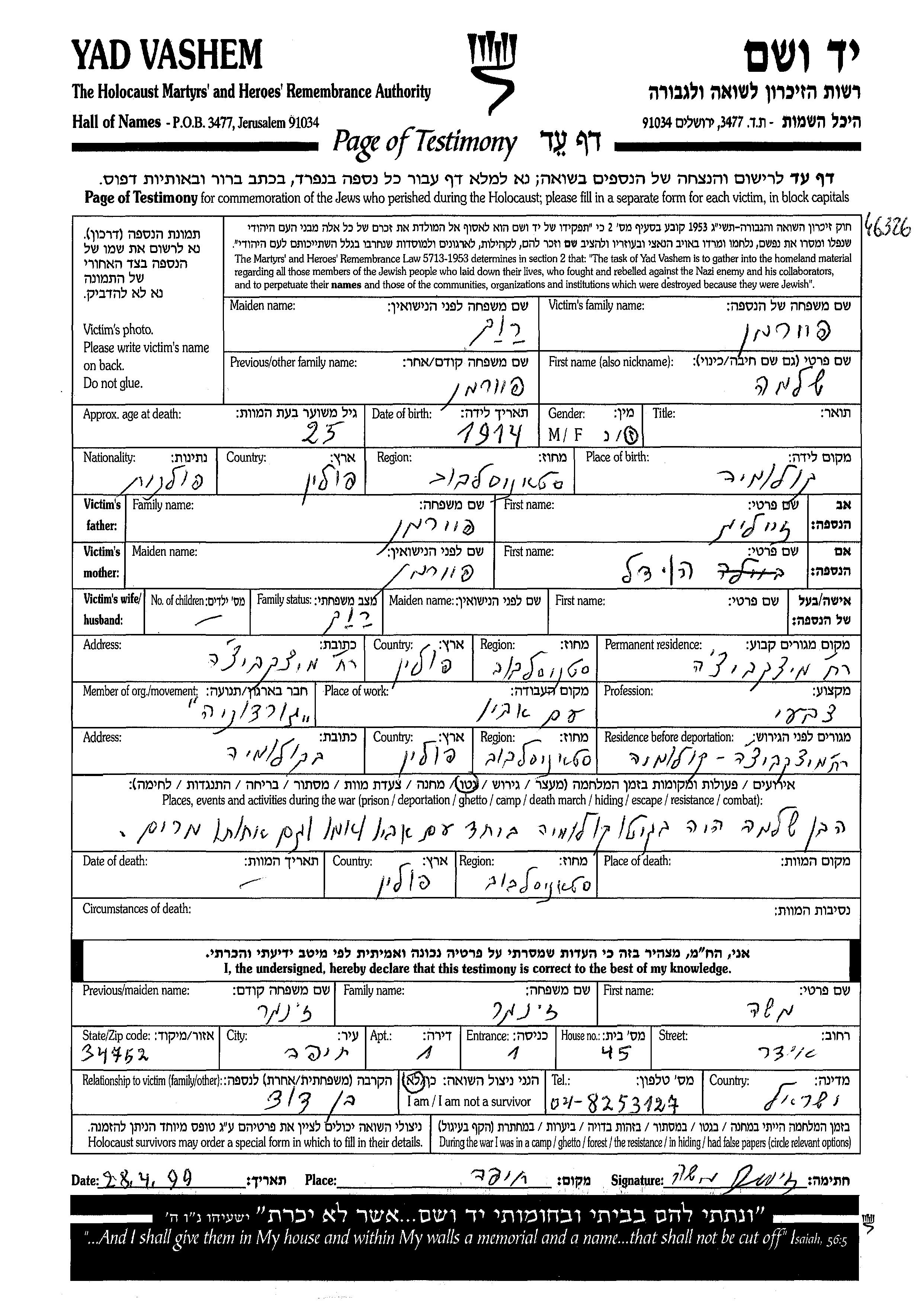 Shlomo Fairman wurde im Jahr 1914 in Kolomyja, Polen geboren. Er war der Sohn von Zeilig und Hudel. Er war Anstreicher/-in und Ledig. Vor dem Zweiten Weltkrieg lebte er in Kolomyja, Polen. Während des Krieges war er in Kolomyja, Polen.