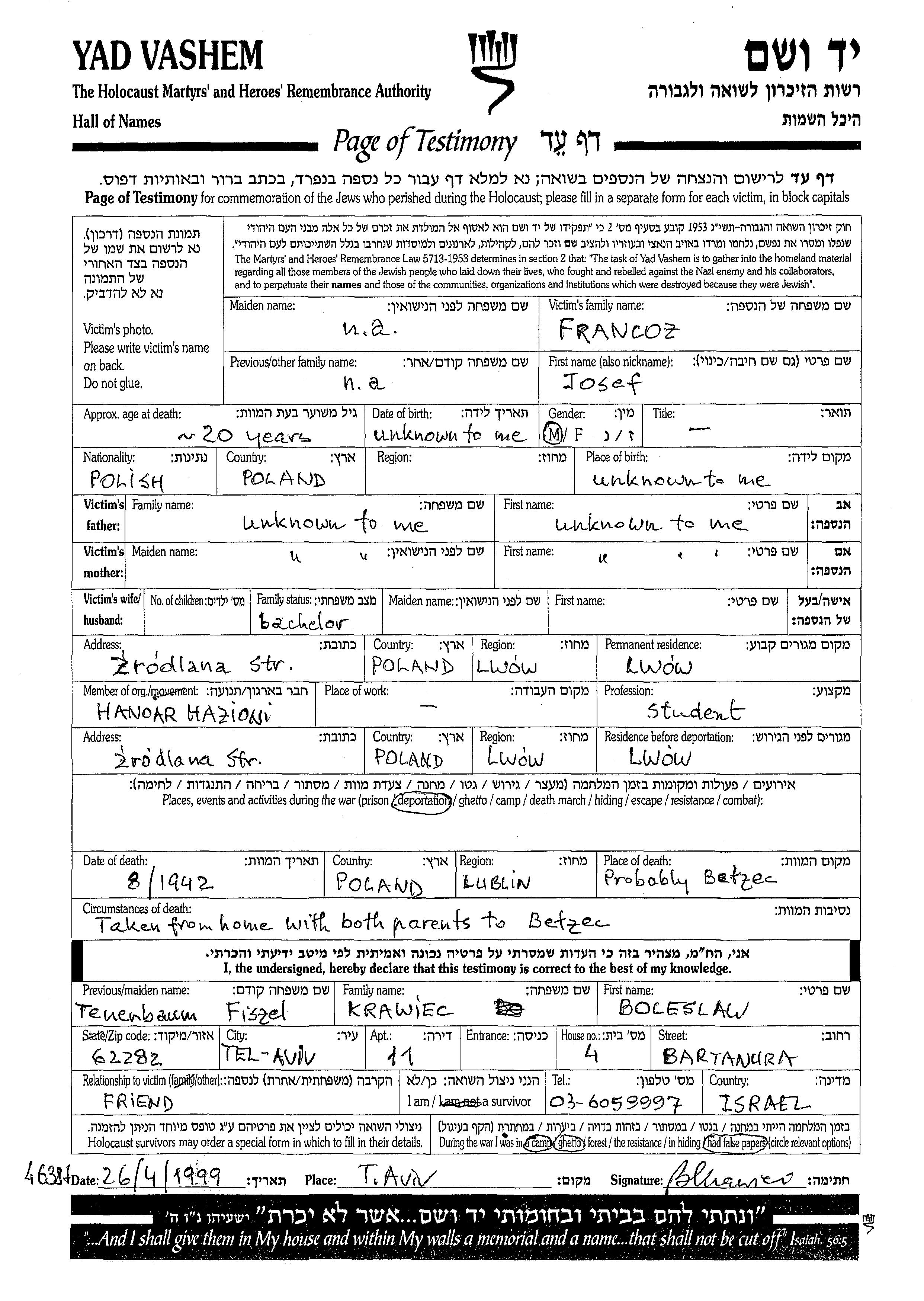 Josef Francoz wurde in Polen geboren. Er war Student und Ledig. Vor dem Zweiten Weltkrieg lebte er in Lwow, Polen. Während des Krieges war er in Lwow, Polen.