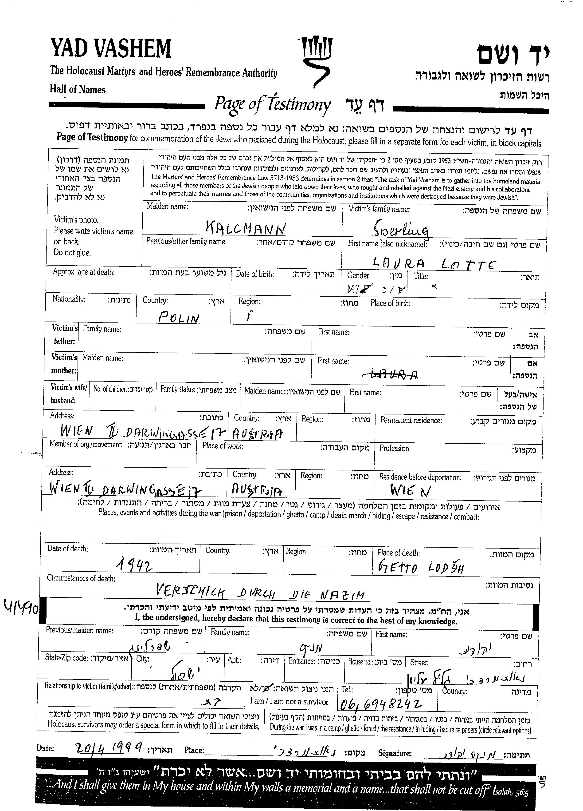 Laura Lotte Sperling, geb. Kalcmann wurde in Polen geboren. Vor dem Zweiten Weltkrieg lebte sie in Wien, Österreich. Während des Krieges war sie in Wien, Österreich.