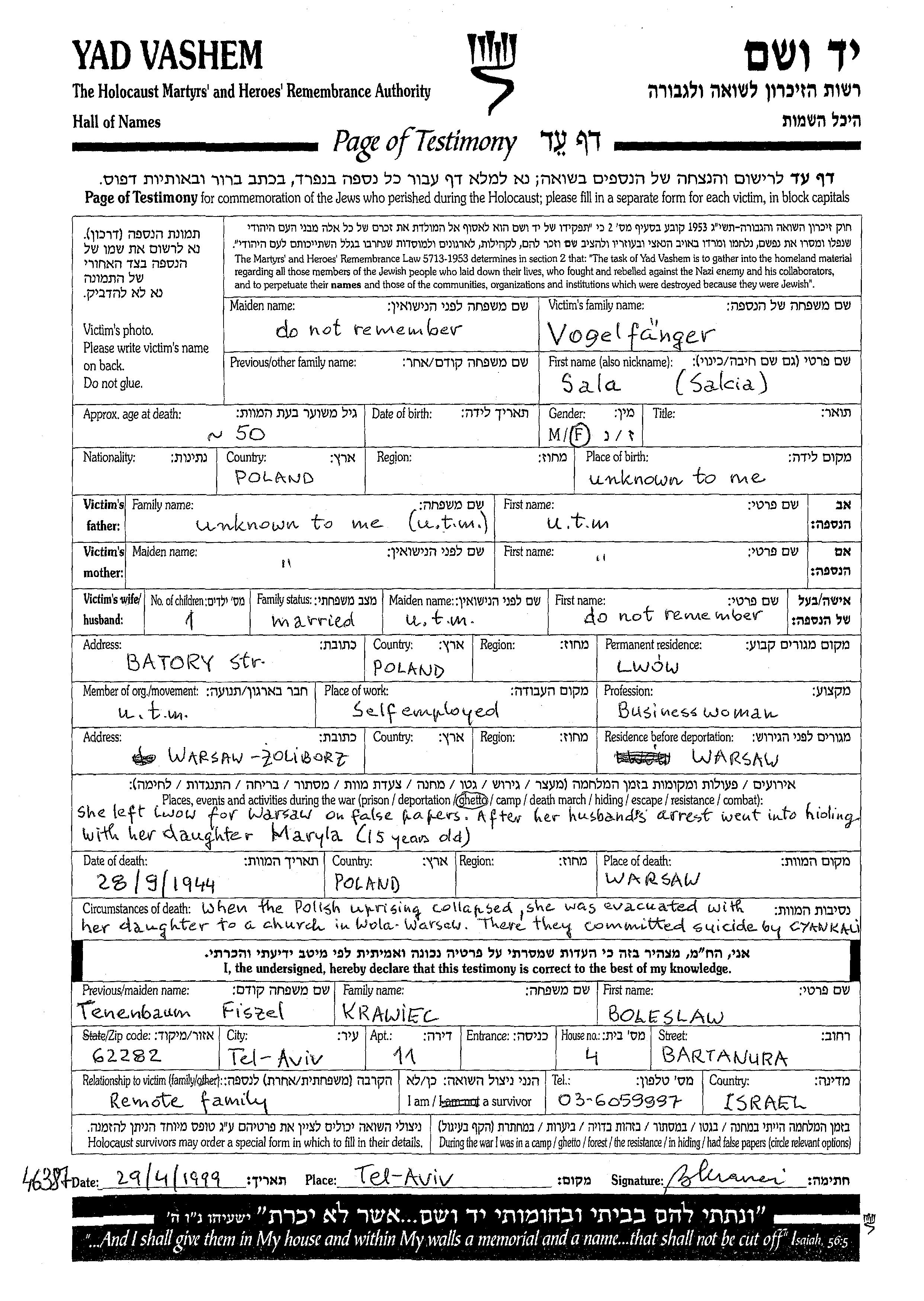 Sala Vogelfanger wurde in Polen geboren. Sie war Geschäftsfrau und Verheiratet. Vor dem Zweiten Weltkrieg lebte sie in Lwow, Polen. Während des Krieges war sie in Warszawa, Polen.