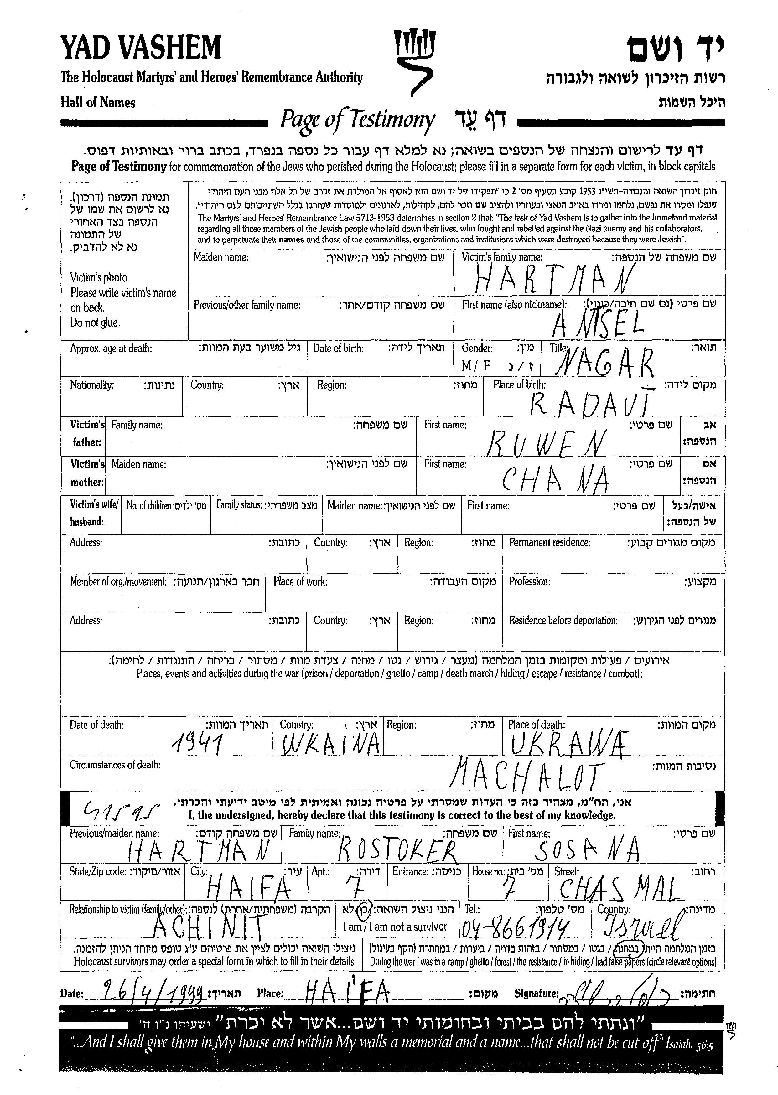 Antsel Hartman wurde in Radauti, Rumänien geboren. Er war der Sohn von Ruwen und Chana. Er war Zimmermann.