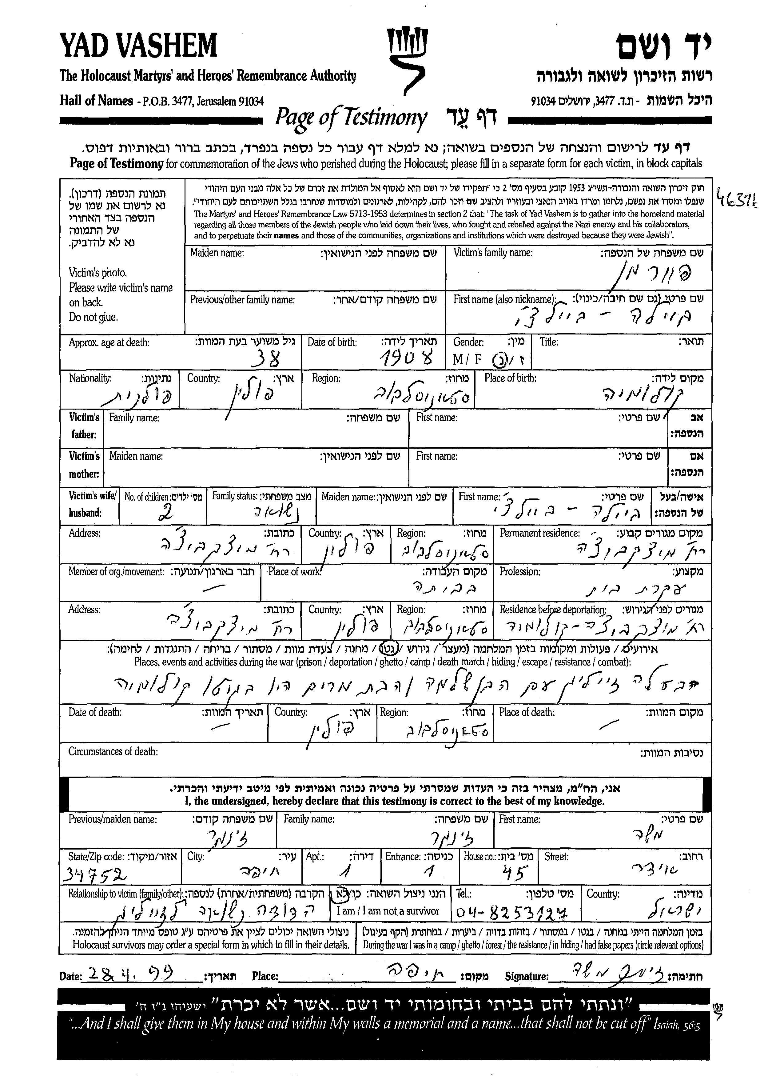 Beila Paverman wurde im Jahr 1908 in Kolomyja, Polen geboren. Sie war Hausfrau und mit Zeilig Verheiratet. Vor dem Zweiten Weltkrieg lebte sie in Kolomyja, Polen. Während des Krieges war sie in Kolomyja, Polen.
