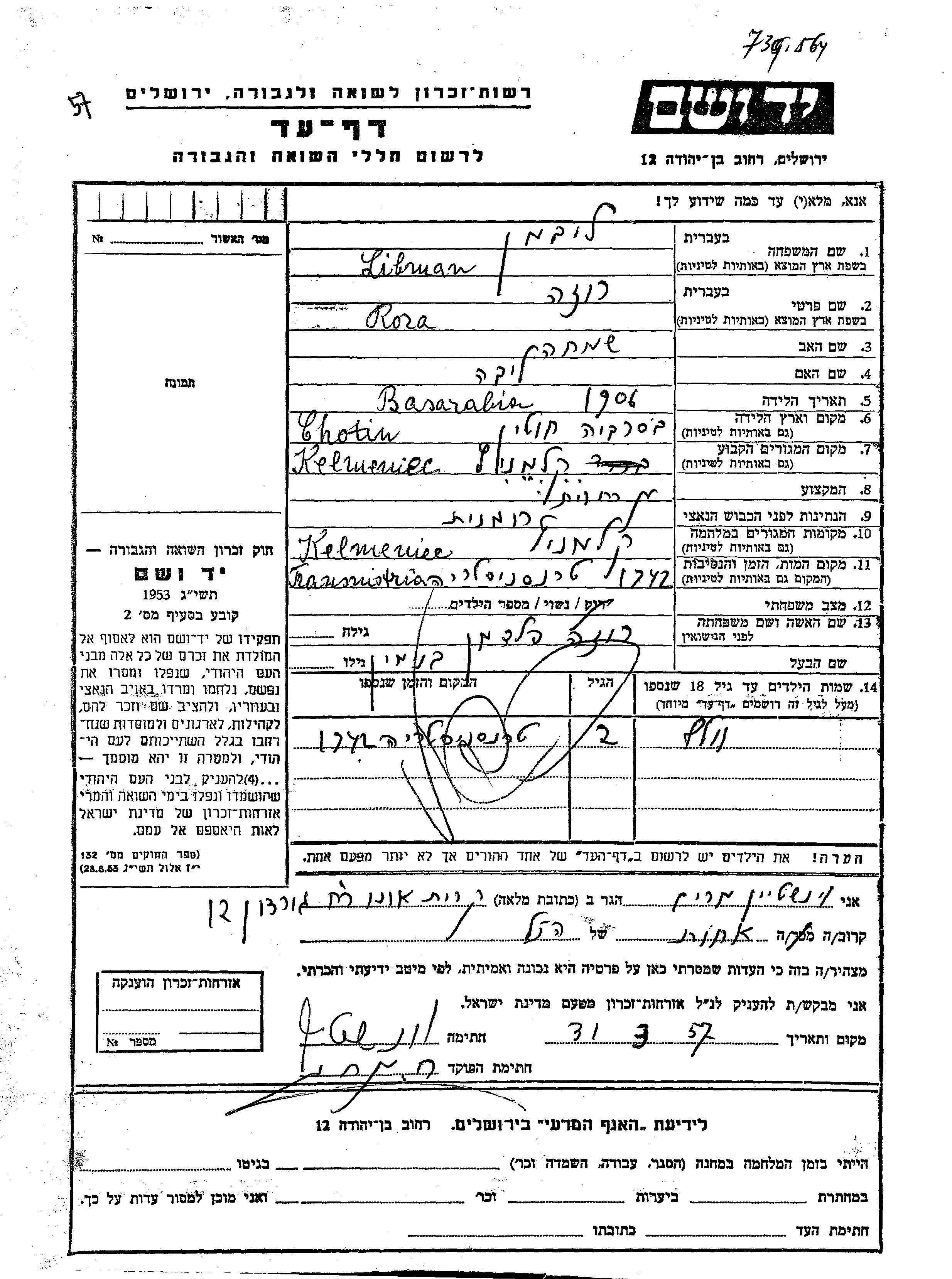 Roza Libman, geb. Feldman wurde im Jahr 1906 in Chotin, Rumänien geboren. Sie war Hausfrau. Vor dem Zweiten Weltkrieg lebte sie in Chelmenti, Rumänien.
