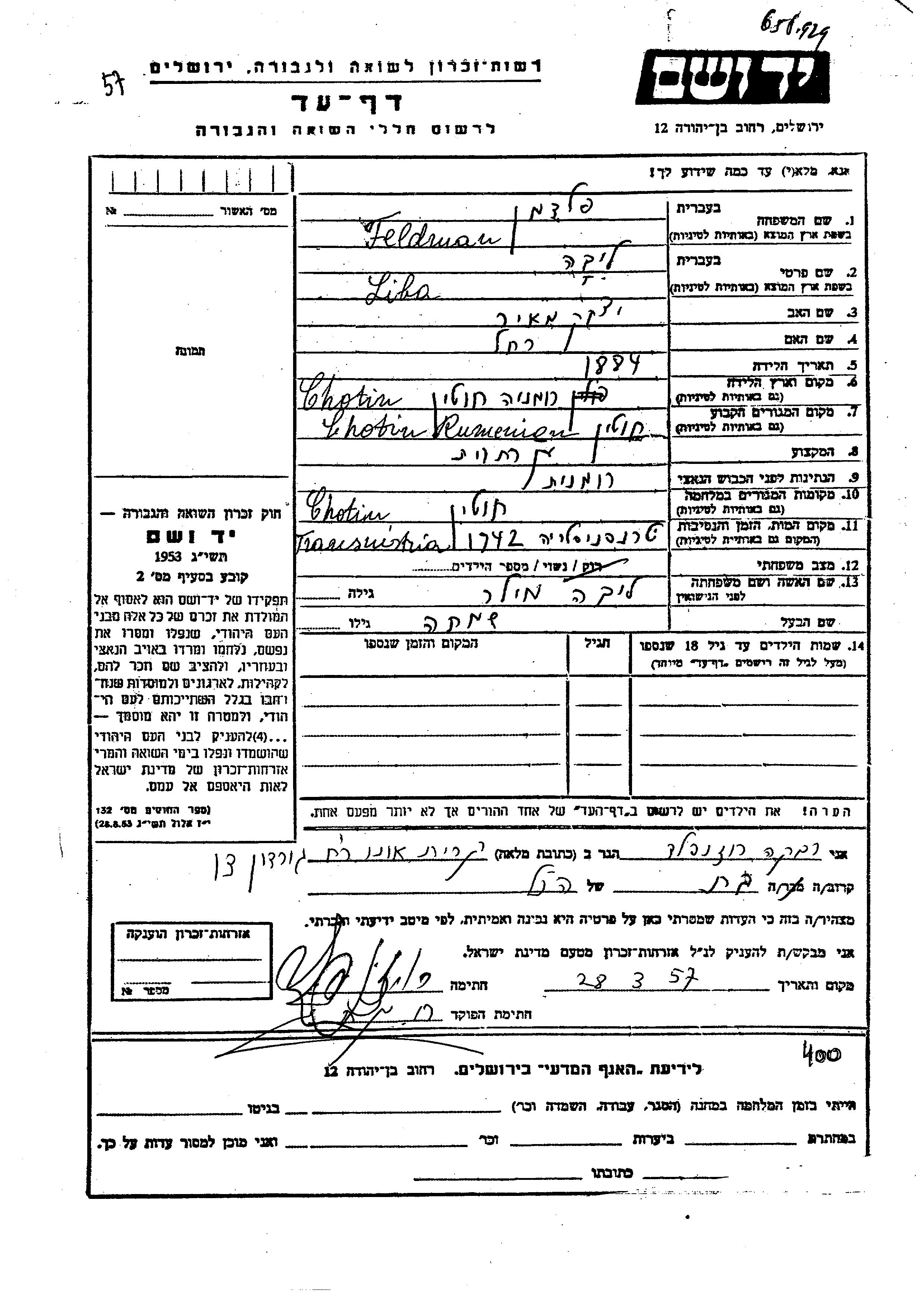 Liba Feldman, geb. Miler. Sie war Hausfrau. Vor dem Zweiten Weltkrieg lebte sie in Hotin, Rumänien.