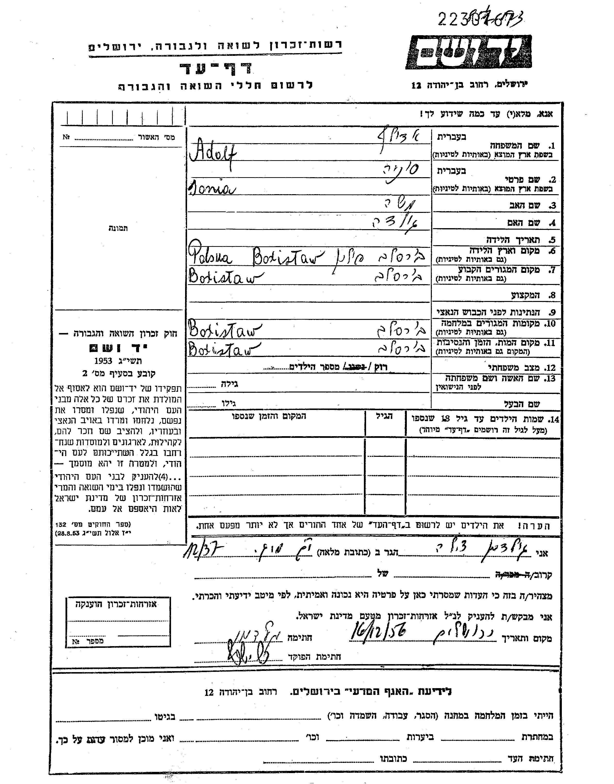 Sonia Adolf wurde in Borislav, Polen geboren. Sie war die Tochter von Moshe und Golda. Sie war Ledig. Vor dem Zweiten Weltkrieg lebte sie in Borislav, Polen. Während des Krieges war sie in Borislav, Polen.