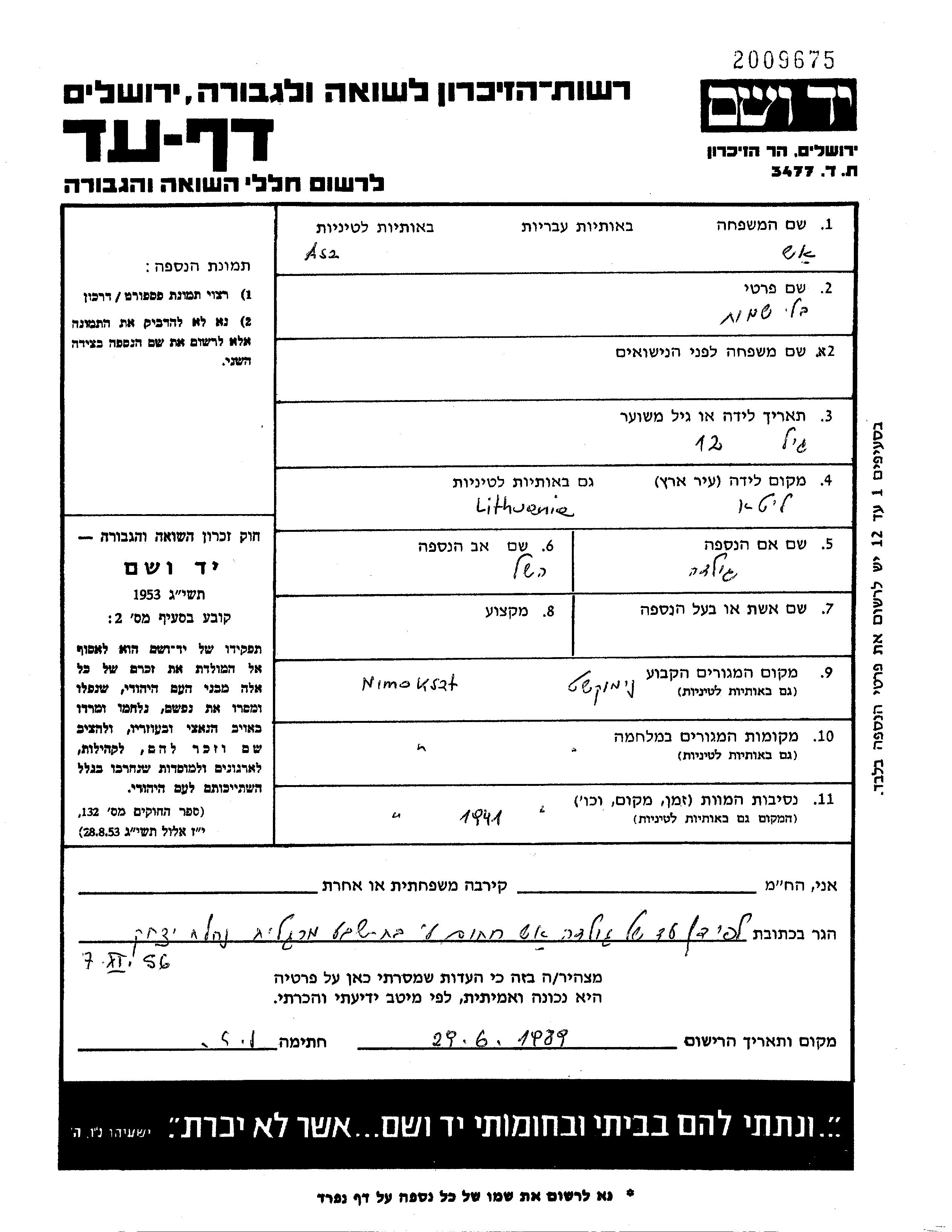 Vorname unbekannt Asz wurde in Litauen geboren. Er/sie war der/ die Sohn/Tochter von Heshel und Golda. Vor dem Zweiten Weltkrieg er/sie in Nimokszt, Litauen. Während des Krieges war er/sie in Nimokszt, Litauen.