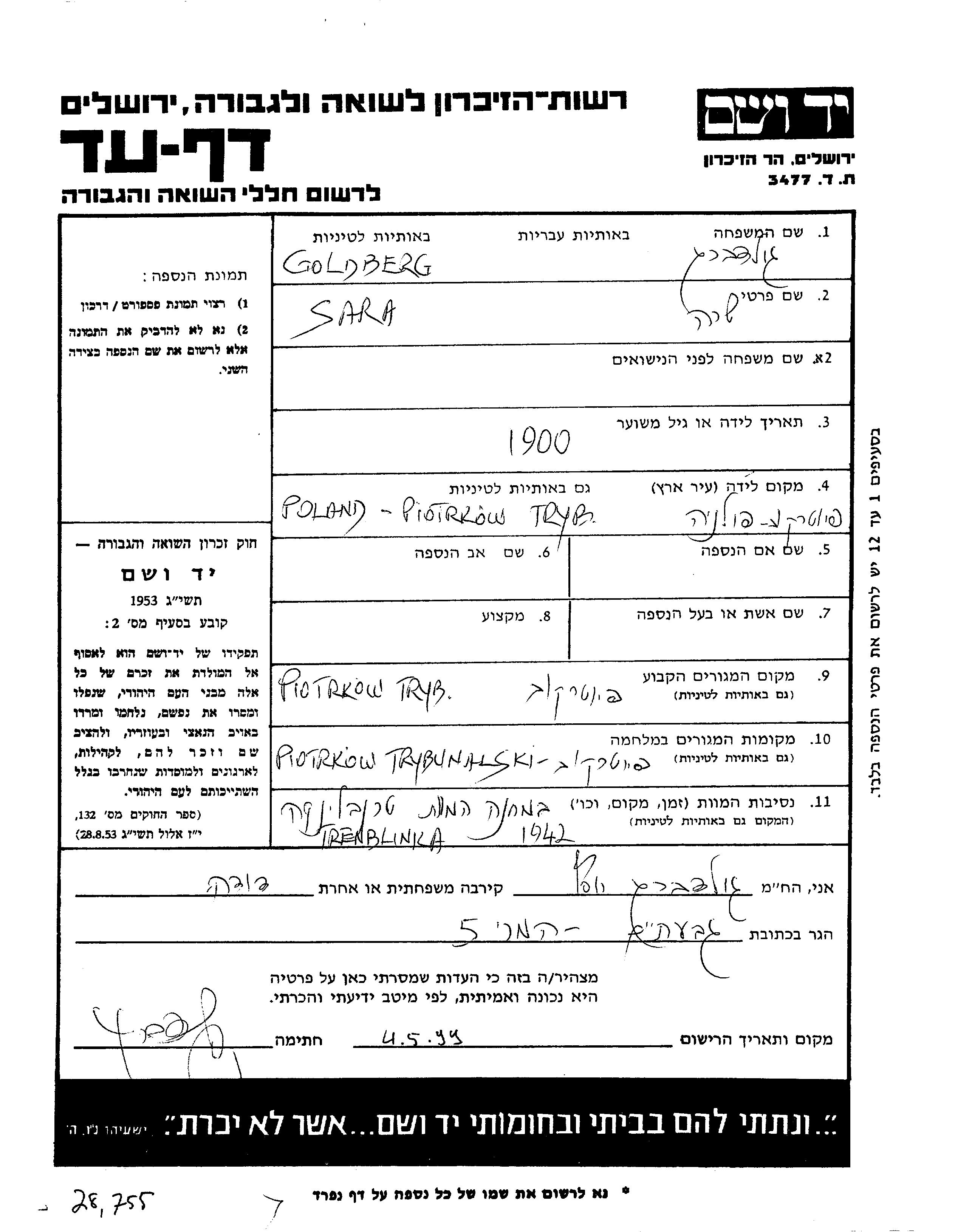 Sara Goldberg wurde im Jahr 1900 in Piotrkow, Polen geboren. Vor dem Zweiten Weltkrieg lebte sie in Piotrkow, Polen. Während des Krieges war sie in Piotrkow, Polen.