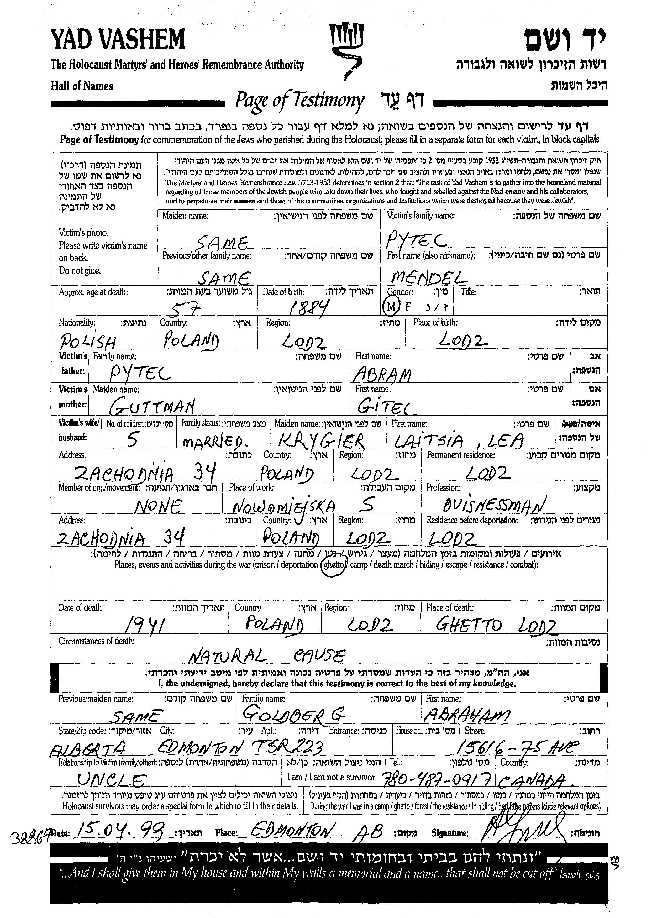 Mendel Pytec wurde im Jahr 1884 in Lodz, Polen geboren. Er war der Sohn von Abram und Gitel. Er war Geschäftsmann und mit Laitsia, geb. Krygier Verheiratet. Vor dem Zweiten Weltkrieg lebte er in Lodz, Polen. Während des Krieges war er in Lodz, Polen.