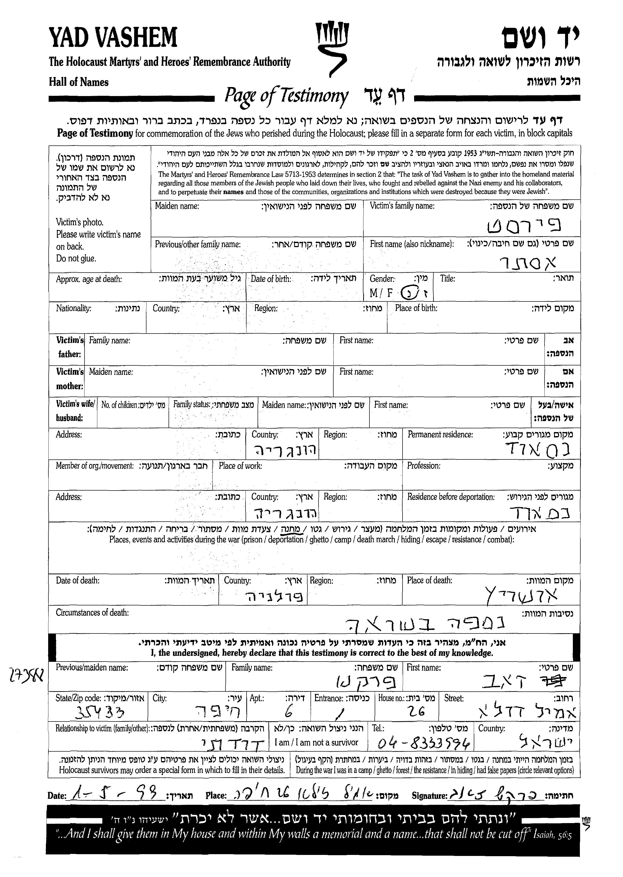 Ester First. Vor dem Zweiten Weltkrieg lebte sie in Nasaud, Rumänien. Während des Krieges war sie in Nasaud, Rumänien.