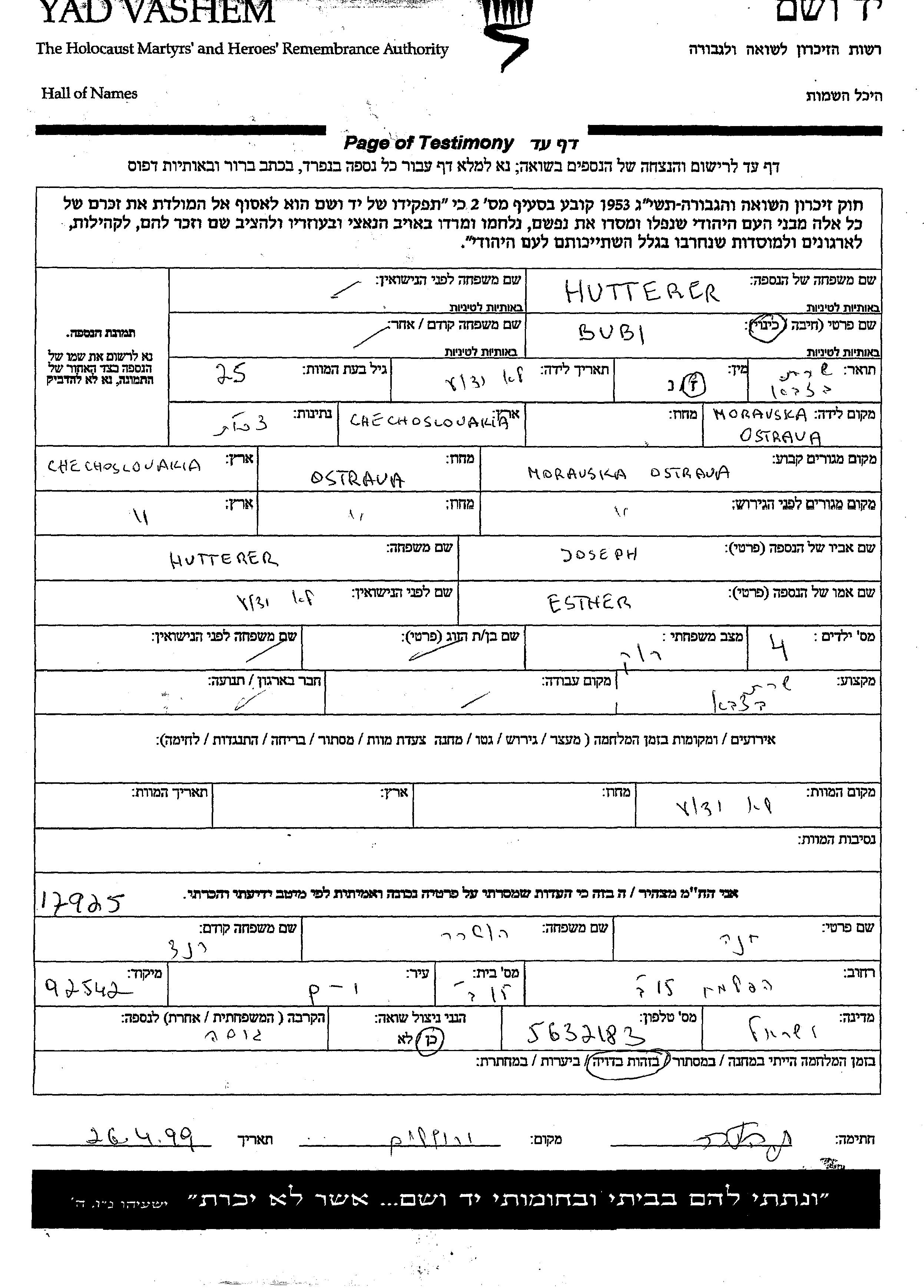 Bubi Hutterer wurde in Moravska Ostrava, Tschechoslowakei geboren. Er war der Sohn von Joseph und Esther. Er war Soldat und Ledig. Vor dem Zweiten Weltkrieg lebte er in Moravska Ostrava, Tschechoslowakei. Während des Krieges war er in Moravska Ostrava, Tschechoslowakei.