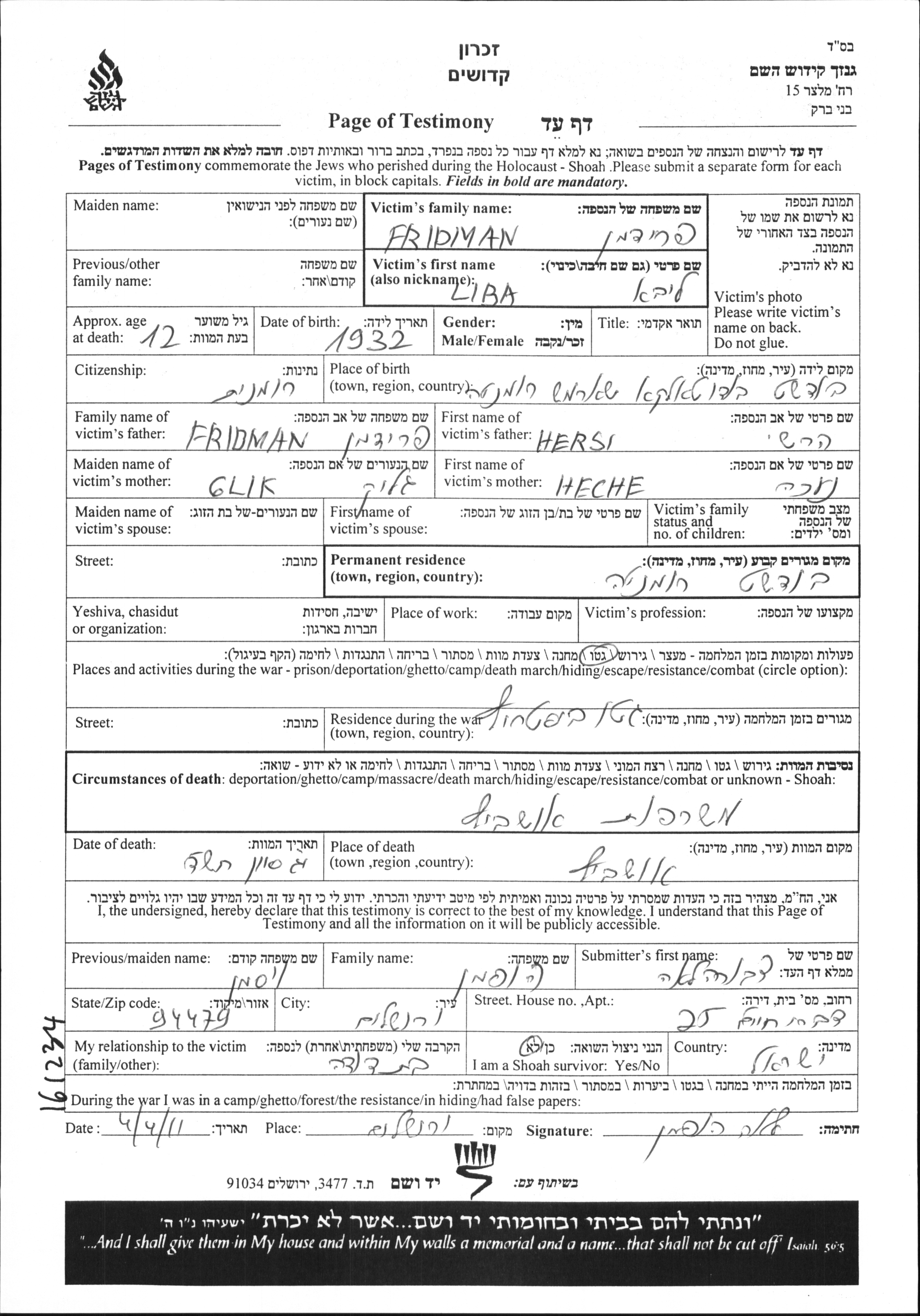Liba Fridman wurde im Jahr 1932 in Budatelec, Rumänien geboren. Sie war die Tochter von Hersi und Neche, geb. Glik. Sie war Kind. Vor dem Zweiten Weltkrieg lebte sie in Budatelec, Rumänien. Während des Krieges war sie in Bistrita, Rumänien.